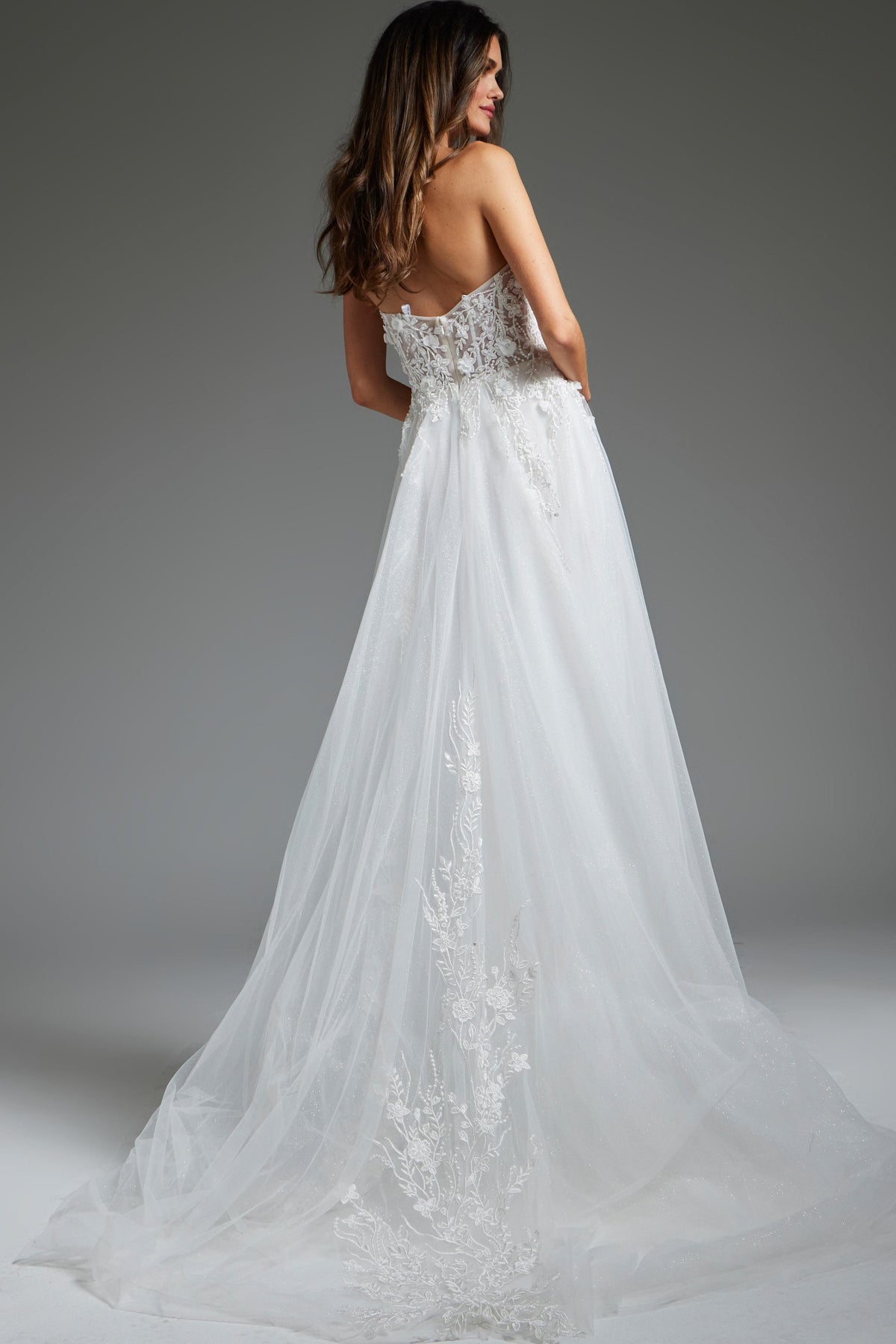 Say "I do" to effortless elegance with this exquisite strapless bridal gown. The sweetheart neckline frames your face beautifully while intricate beading and delicate floral appliques embellish the fitted bodice. Designed in soft, flowing tulle, the A-line skirt cascades to the floor with graceful movement that makes every step feel magical. Perfect for the bride who desires timeless sophistication and romantic charm on her wedding day.