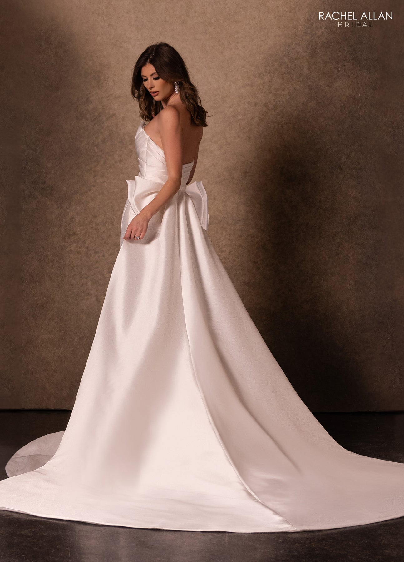 The Rachel Allan RB5106 Dress is minimalist luxury at its finest. Crafted in sleek mikado fabric, this mermaid silhouette dazzles with a pleated bodice and a plunging neckline that brings just the right amount of drama. Switch up your look with the detachable train and oversized bow for a playful twist on timeless elegance. Available in Ivory, Light Rum Pink, or White, it’s made for brides who love chic sophistication with a fun flair.