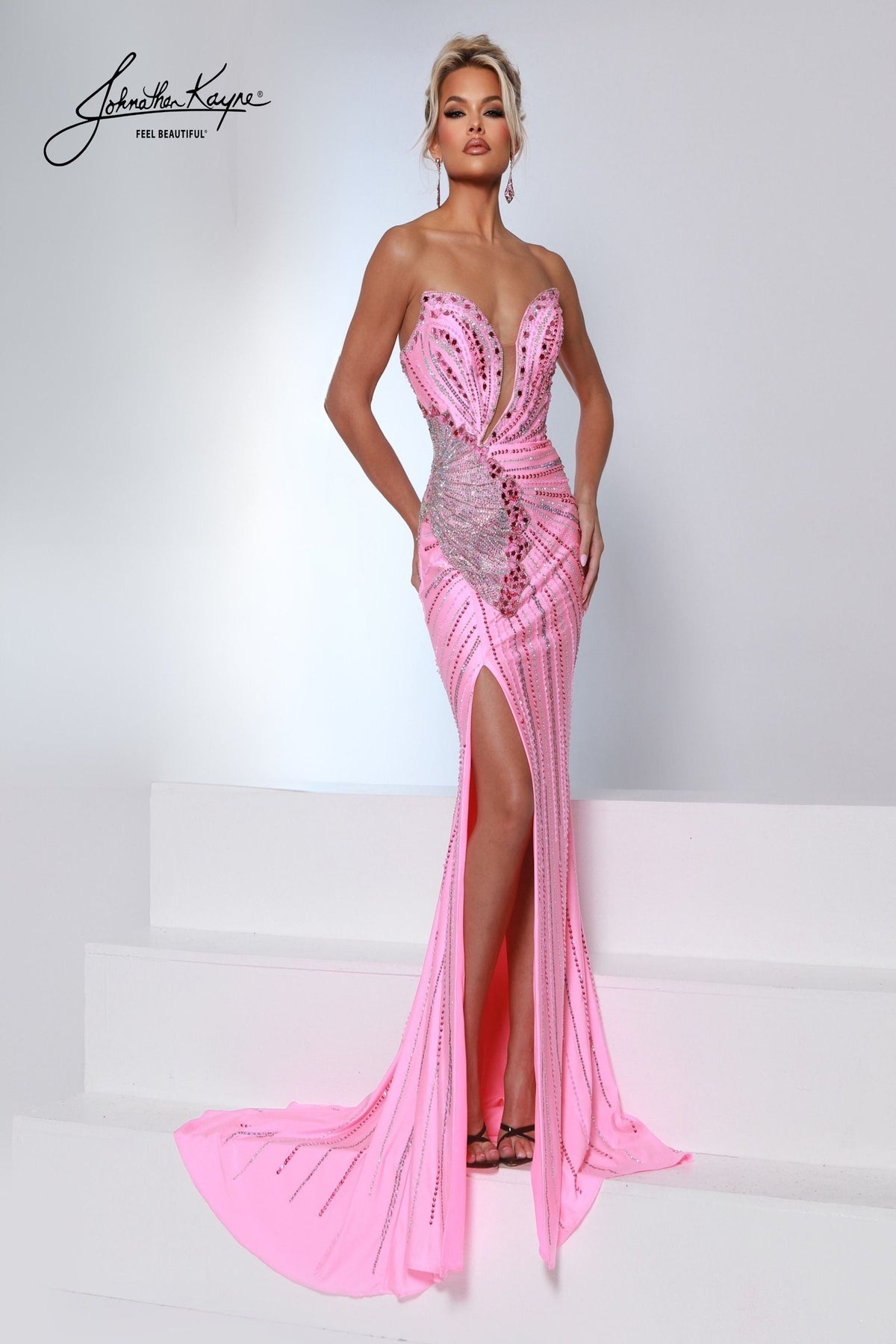 Make a statement in the Johnathan Kayne 3200 Dress, designed to celebrate your confidence and elegance. This stunning strapless gown features intricate beadwork that catches the light beautifully, paired with a daring plunging neckline and a graceful side slit. The corset back ensures a secure, flattering fit that moves with you, while the curve-hugging silhouette highlights your best features. Whether you're competing on stage or walking the red carpet, this show-stopping dress empowers you to shine with timeless glamour and poise.