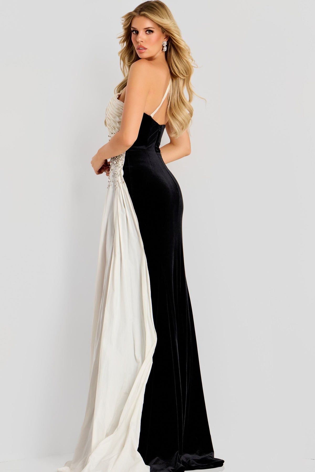 Make a statement in this stunning Jovani 42140 dress, where elegance meets modern sophistication. The one-shoulder silhouette and sleek sheath cut create a flattering, streamlined look, while the luxurious velvet and satin combination adds rich texture and movement. A dramatic high slit and gathered side detail with intricate beading elevate the design, while the open back with delicate strap detail reveals just the right amount of allure. Perfect for formal events, this floor-length gown combines timeless glamour with contemporary style.