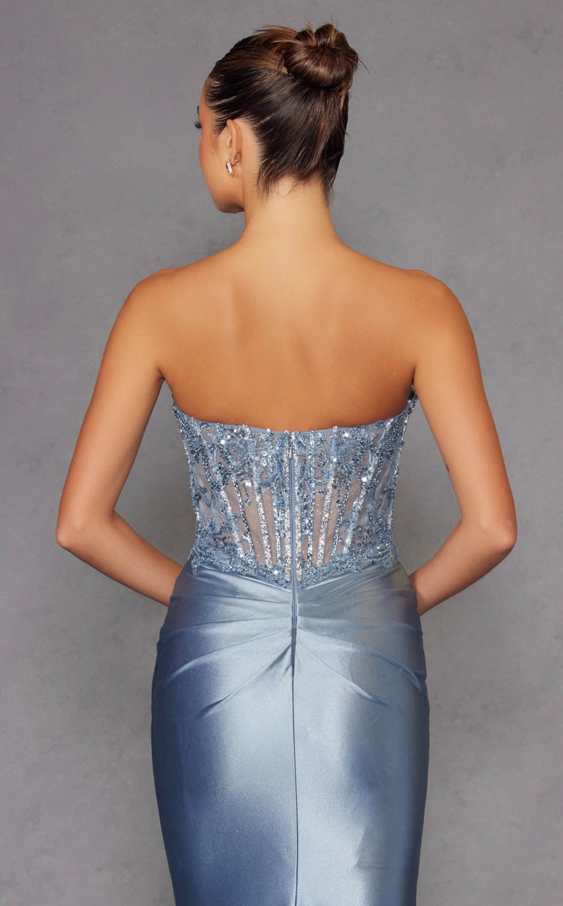 Step into the spotlight with the Juliet JT2530K, a show-stopping strapless gown that commands attention. The sheer corset bodice sparkles with intricate beadwork, while the luxurious satin skirt hugs your curves before gracefully flowing outward at the hem. Perfect for galas, formal events, and unforgettable nights, this dress lets you radiate confidence and elegance with every step.