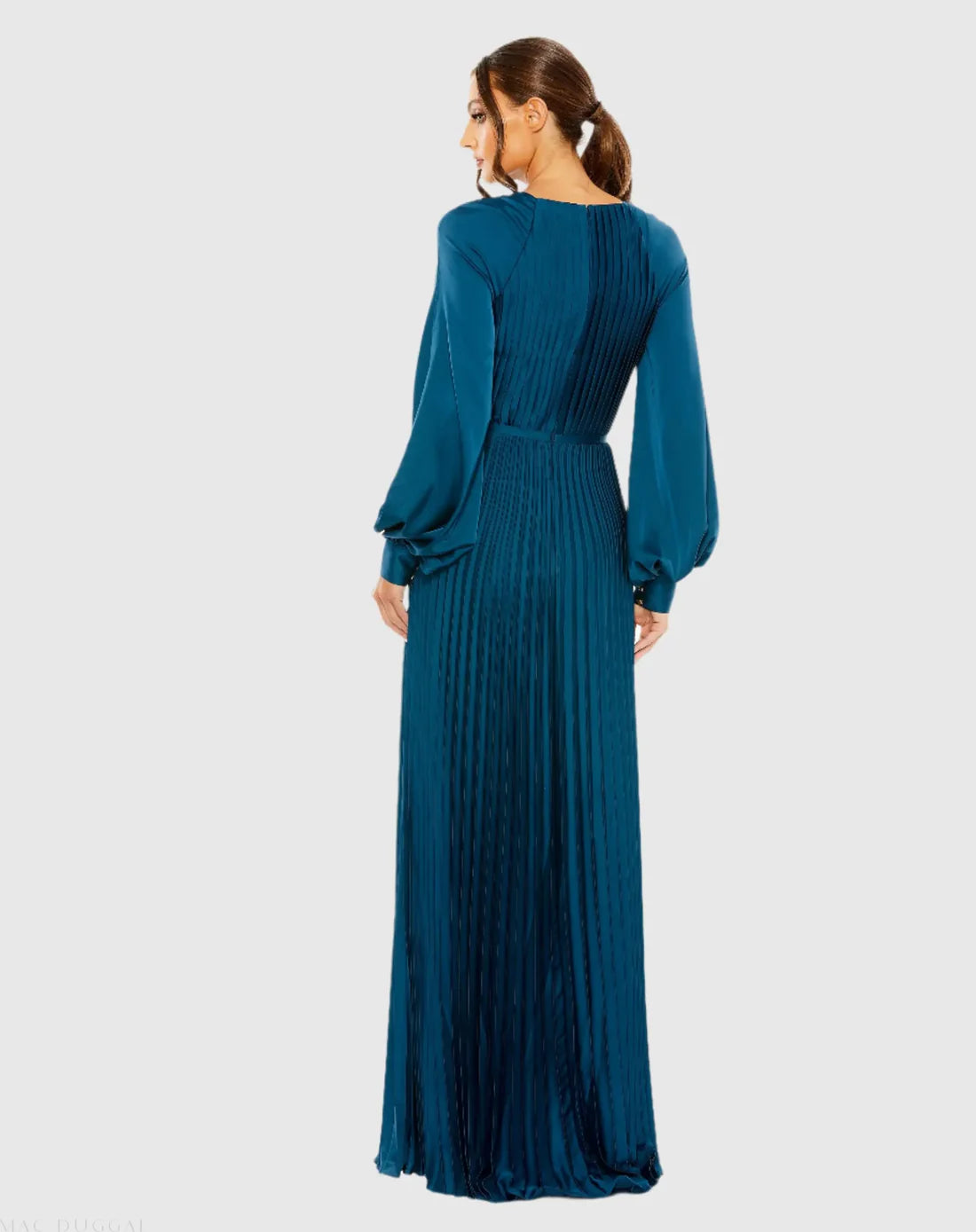 فستان مطوي بأكمام طويلة ورقبة عالية وأكمام واسعة وصدرية مطوية وشق يصل إلى الفخذ.