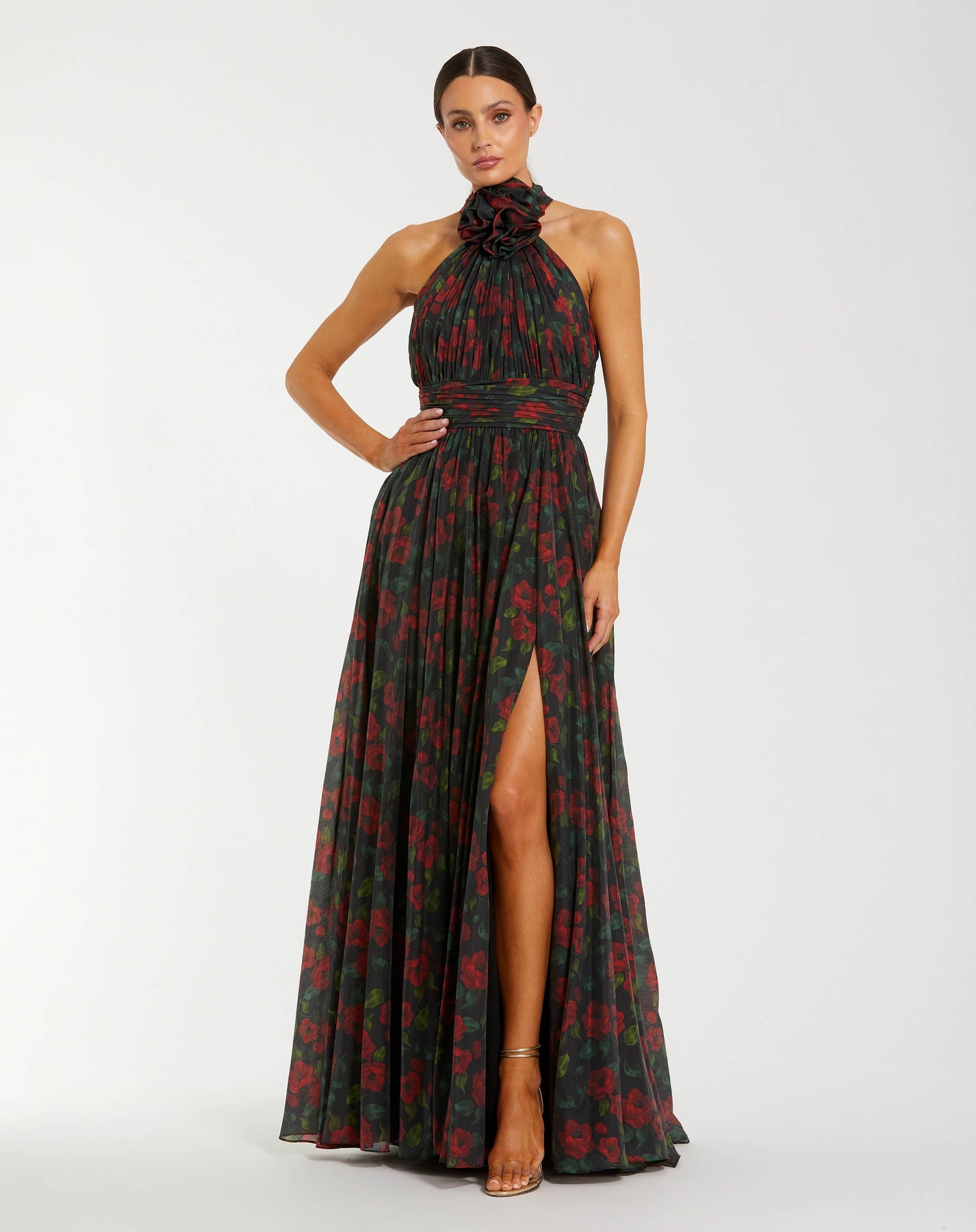 - Soft pleating throughout bodice and skirt