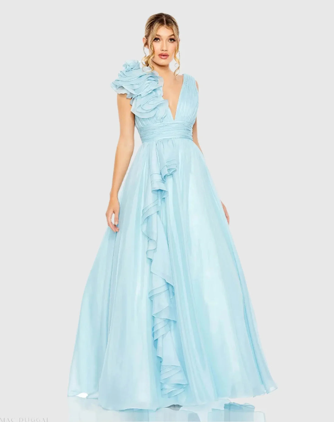 فستان سهرة بدون أكمام بفتحة رقبة على شكل حرف V مع أكتاف مكشكشة وخصر إمبراطوري مجعد وكشكشة تتدفق على طول التنورة.