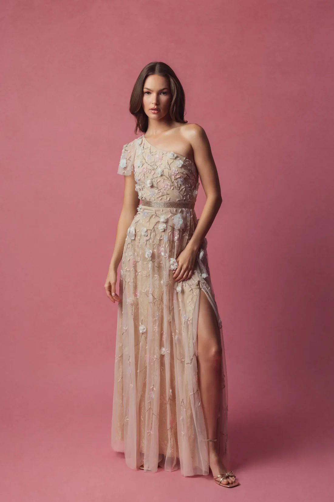 فستان مزين بالورود بكتف واحد على شكل حرف A