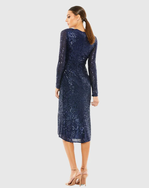 فستان ميدي بأكمام طويلة مزين بالترتر، يتميز بصدرية ملفوفة، وفتحة رقبة على شكل حرف V جذابة، وتنورة متوسطة الطول بتصميم منسدل مع شق أمامي جريء. مثالي للخروجات المسائية أو المناسبات الخاصة، فهو يجمع بين الأناقة والبساطة.