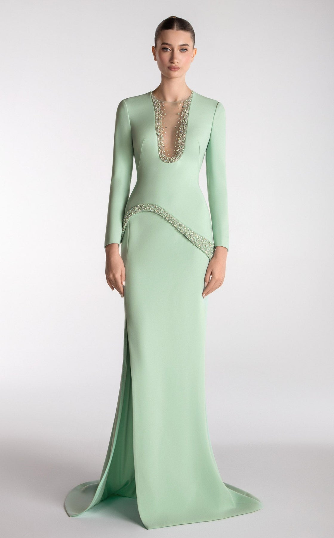 Step into elegance with the Gatti Nolli Couture OP7733 Dress. This long, flowing gown features graceful long sleeves and a flattering V-neck that adds a touch of allure. The smooth fabric hugs your silhouette, while delicate beading at the waist sparkles subtly to catch the light. A closed back finishes the look with understated sophistication, perfect for making a memorable entrance at any event. Feel effortlessly charming and poised in this stunning dress.