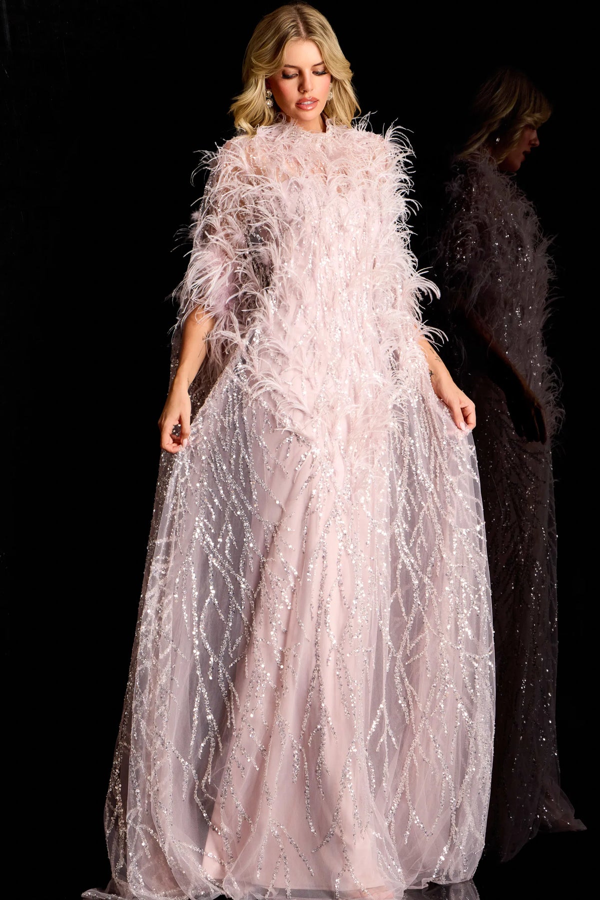 Elevate your evening with the stunning Jovani 44593 Dress, a floor-length masterpiece designed to make you feel absolutely radiant. This sophisticated gown features a high neckline and sleek column silhouette that flatters your figure beautifully. The intricate beaded tulle fabric is adorned with delicate feather embellishments throughout, creating an enchanting, dimensional look. The showstopping cape-style feathered sleeves and flowing cape overlay add dramatic movement and elegance, while sheer layering details provide a touch of modern refinement. With its fully beaded pattern and covered back design, this dress offers complete coverage with undeniable glamour perfect for galas, formal events, or any occasion where you want to shine with confidence and grace.