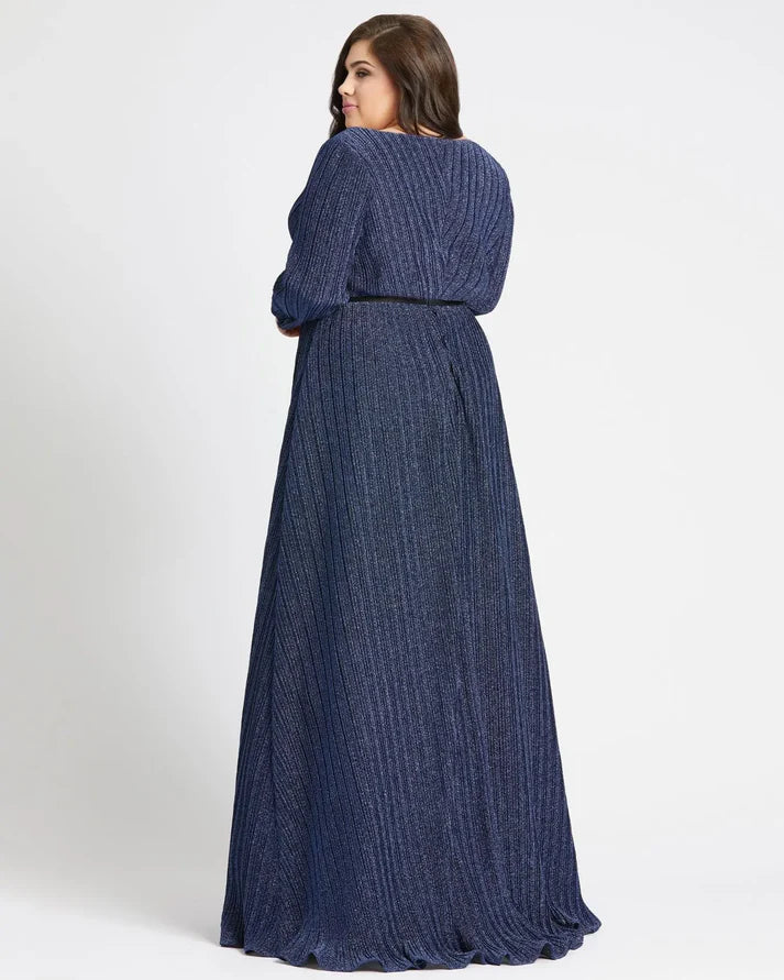 فستان سهرة أنيق بأكمام طويلة مع صدّار ملفوف بشكل مطوي وفتحة رقبة على شكل حرف V وحزام أسود عند الخصر.