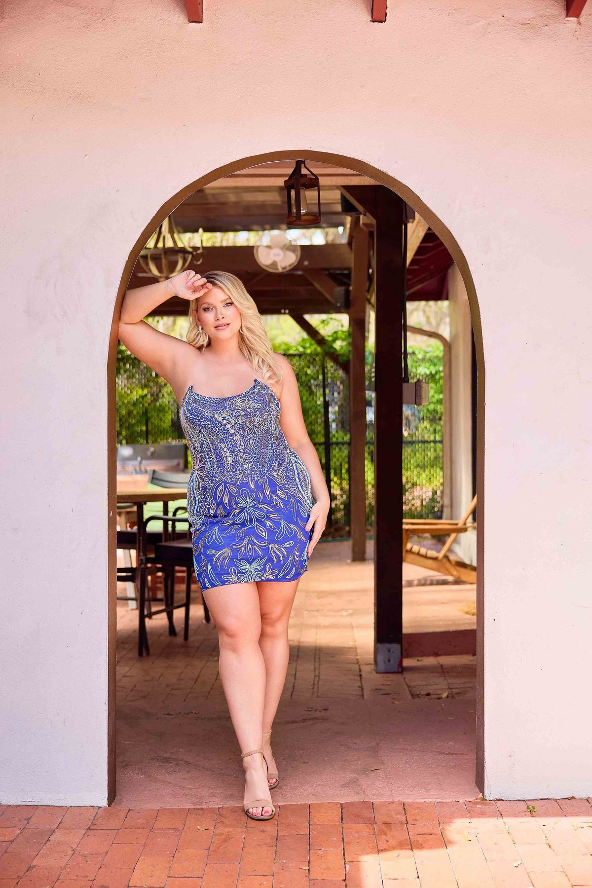 This fitted Primavera 14094 mini dress is adorned with intricate beadwork in swirling patterns that create a dazzling effect. The strapless neckline adds a sleek and flattering touch, while the lace-up back detail enhances the fit and adds a playful twist. Designed to accentuate curves, this dress is perfect for standing out at any special occasion.