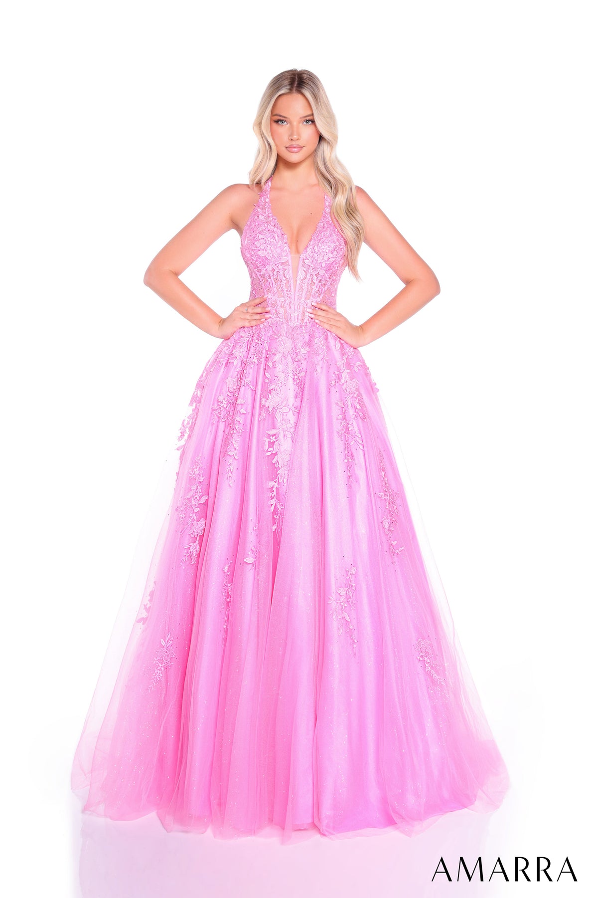 Amarra Plunging Neckline Halter Ball Gown with Lace Appliqué Style 89317 is made to give you that breathtaking, fairytale moment the second you step into the room. This ball gown flows softly around you and creates a full and graceful silhouette that feels dreamy and truly special. The plunging neckline draws the eye beautifully while still feeling balanced and elegant. The halter design frames your shoulders and neckline in a way that feels secure and flattering. Delicate lace appliqué details are placed with care, which catches light gently as you move. These details make the gown feel rich and magical up close, while the flowing skirt creates a soft, floating effect from afar. The fabric moves smoothly with you, so every turn feels natural and graceful. This halter ball gown is designed for moments where you want to feel like the main character. The overall look is timeless and made to leave a lasting impression.