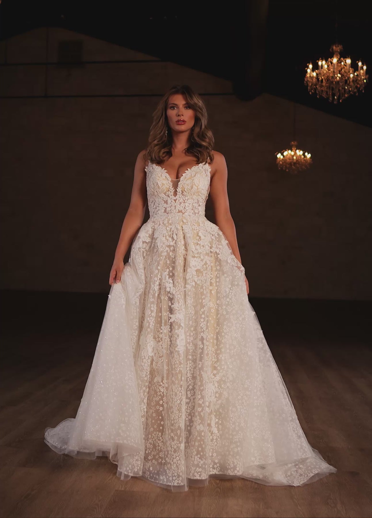 This Rachel Allan RB3204 dress boldly captures timeless romance with a daring twist. Its delicate spaghetti straps and plunging V-neckline frame the bodice, richly detailed with cascading floral lace appliqués that create striking texture. The full A-line skirt, layered in sheer lace and intricate floral patterns, flows into a sweeping train, delivering both elegance and captivating movement. Perfect for the bride who wants to command attention while embracing a sophisticated, modern allure.