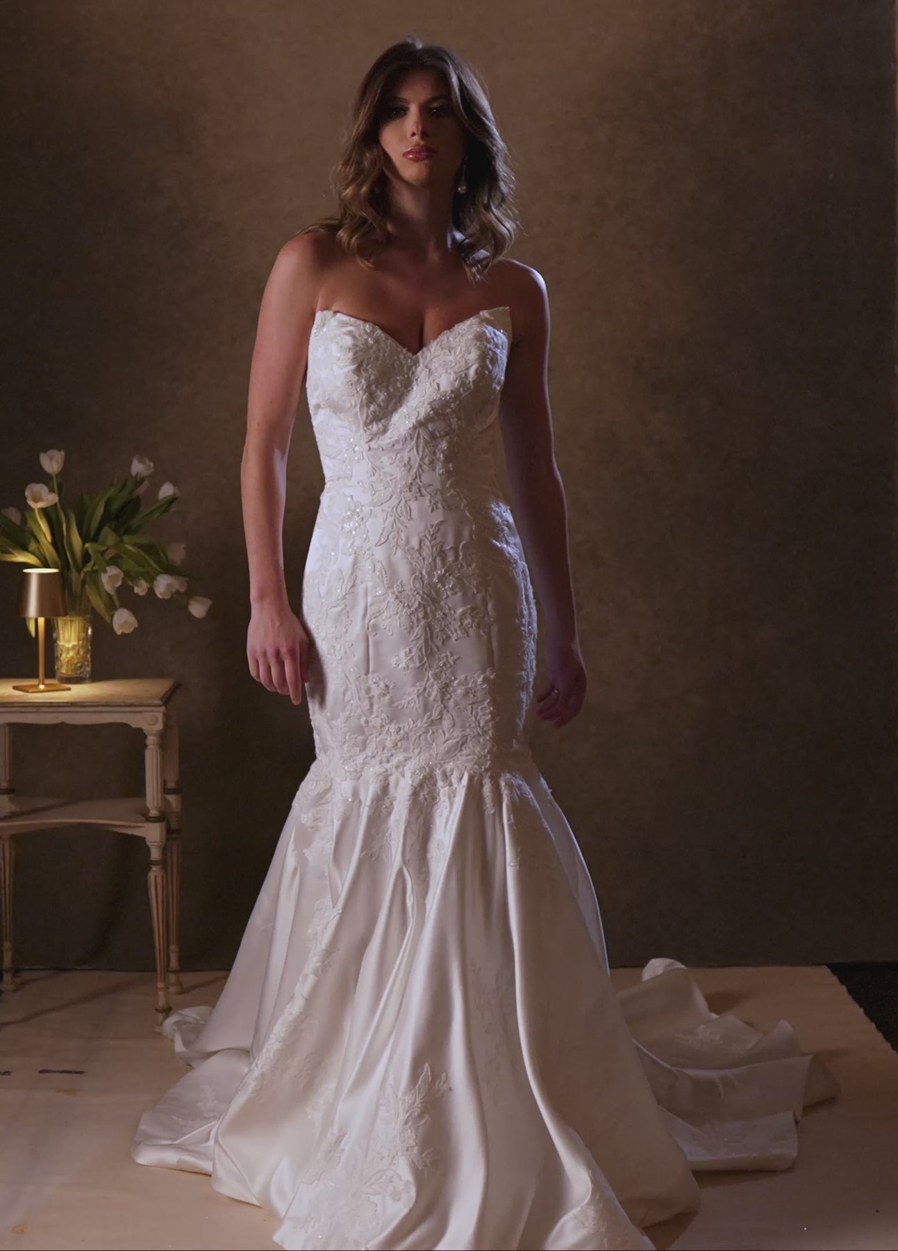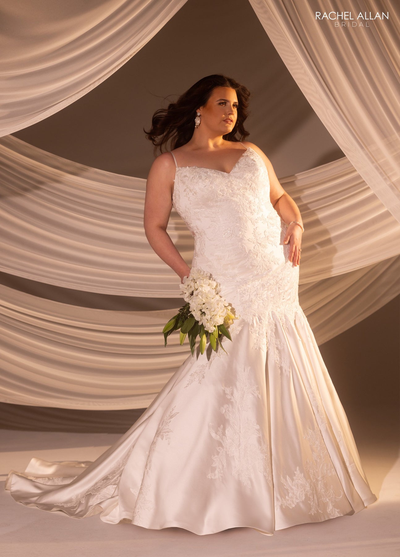 Slip into the Rachel Allan RB3232, a daring satin mermaid gown that embraces your silhouette flawlessly. Intricate lace appliques and delicate beadwork cascade along the bodice and flare, creating a mesmerizing effect. The illusion corset back adds a provocative twist, blending sophistication with allure. Choose Ivory Nude or White to captivate the room with confidence and grace on your special day.