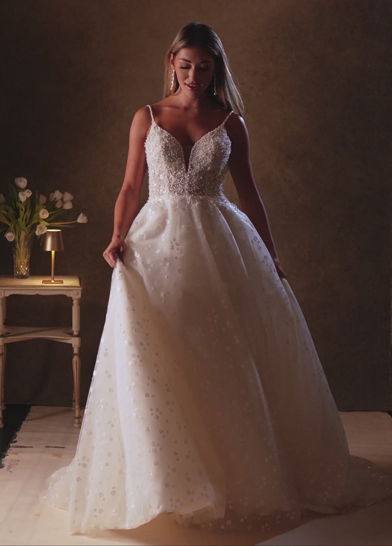 The Rachel Allan RB4218 Dress commands attention with layers of glitter tulle, captivating 3D floral appliqués, and shimmering beadwork. Its illusion bodice and plunging neckline carve a bold, modern silhouette, while the full skirt flows with seductive grace. Featuring a detachable liner and available in Ivory Pearl, Ivory, or White, this gown is for the bride unafraid to embrace soft sparkle and daring romance.