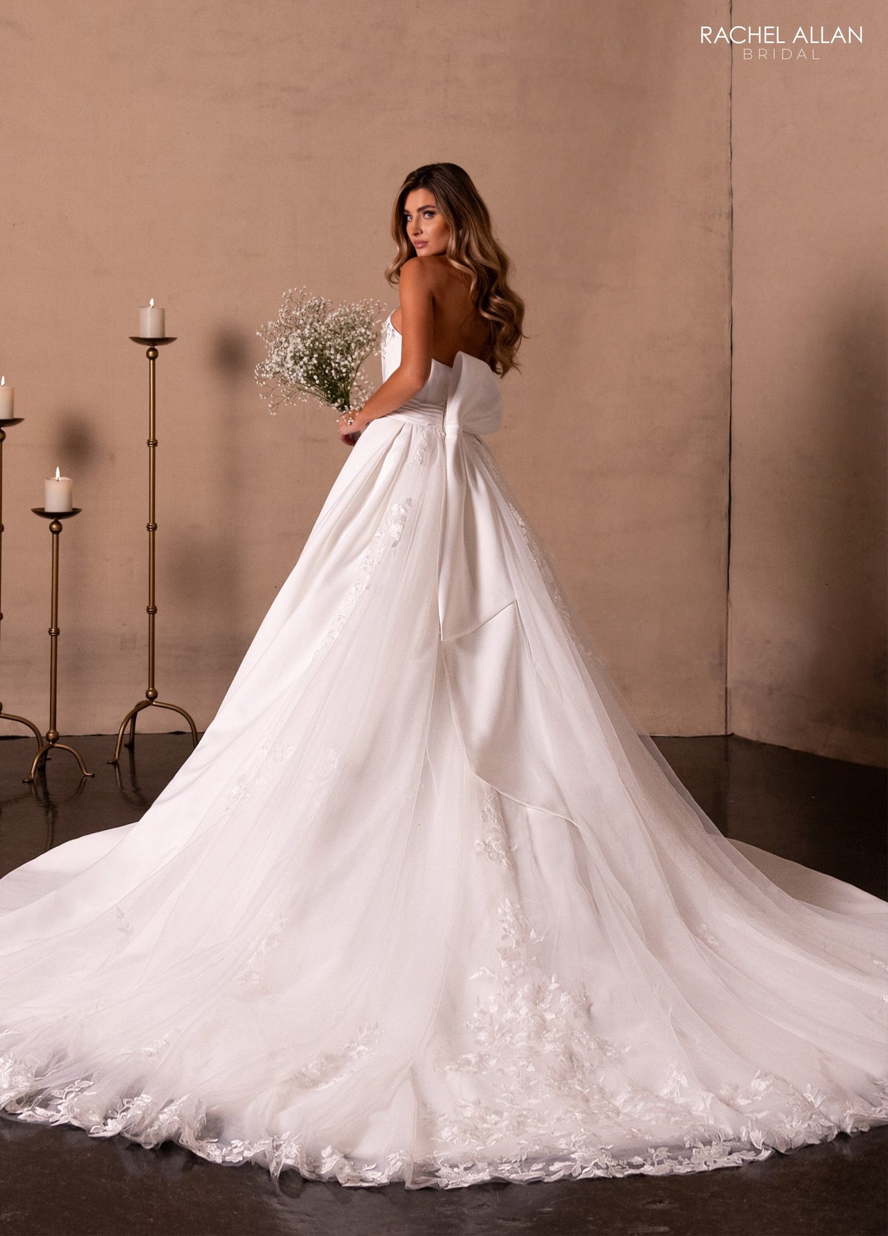 The Rachel Allan RB4221 Dress commands attention with its structured satin bodice and dramatic ball gown silhouette. An embroidered tulle overlay adorned with delicate applique and beading adds intricate allure, while detachable lace sleeves and an oversized bow deliver bold versatility. This all-ivory masterpiece transforms from timeless elegance to modern daring, perfect for brides who want to own every moment with fearless sophistication.