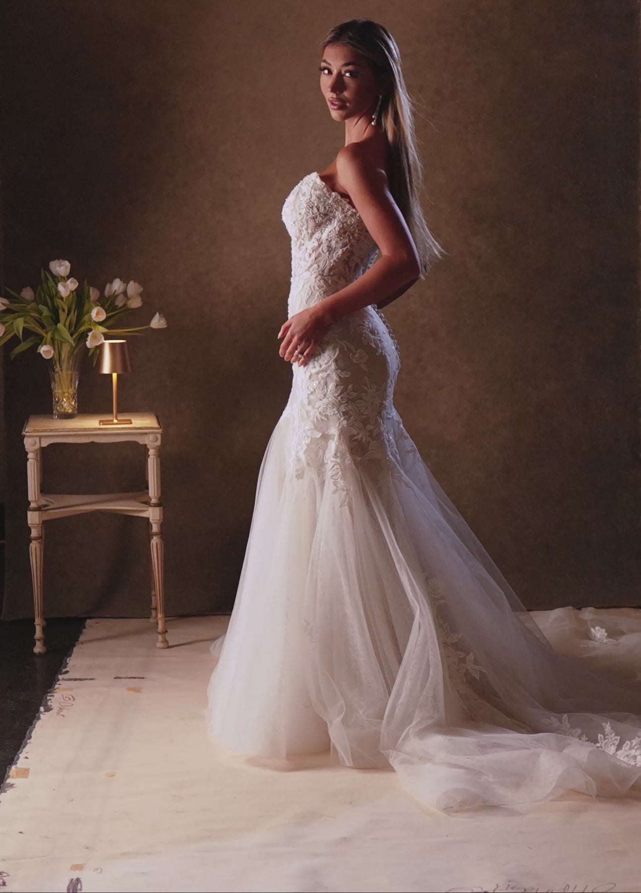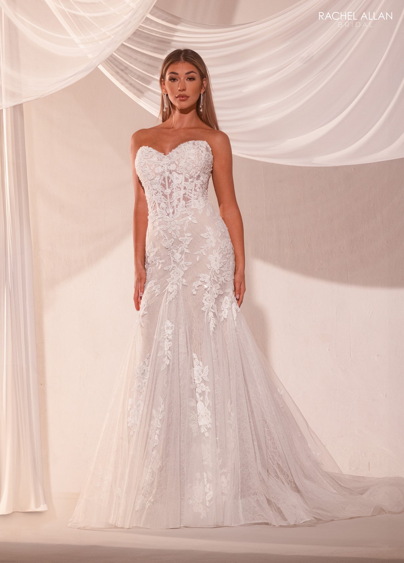 Get ready to twirl in the Rachel Allan RB5105 Dress! This strapless beauty features a corset-inspired bodice sparkling with delicate beading and floral appliqué, making every moment feel magical. The soft, flared skirt flows effortlessly into a graceful train, perfect for making an entrance. With a detachable bodice liner and your choice of Ivory Sand, Ivory, or White, this gown combines elegance with just the right touch of flirtiness. Perfect for the bride who wants to shine and play all night long!