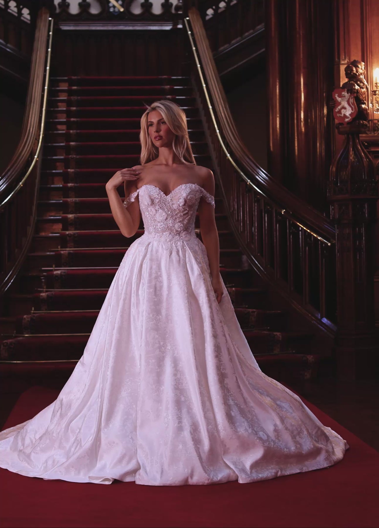 Rachel Allan RB5122 This ivory nude ballgown is basically your red carpet moment waiting to happen. Crafted from sumptuous brocade with an off-the-shoulder neckline and softly draped sleeves, it's the definition of effortless glamour. The structured bodice hugs you in all the right places while the full, sweeping skirt transitions into a regal train that commands attention. Perfect for brides who want that timeless elegance with a playful modern edge—because who says you can't have both?
