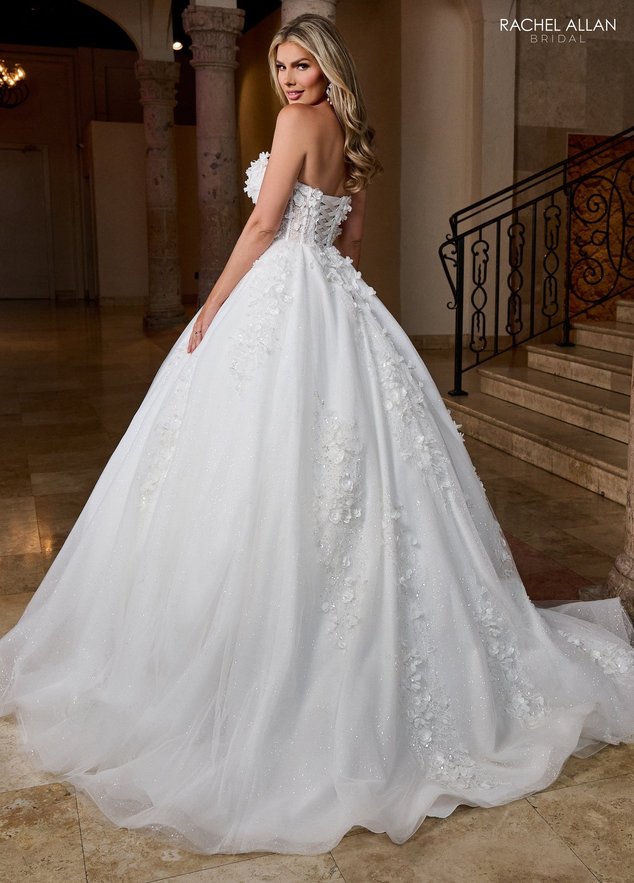 Step into unforgettable allure with the Rachel Allan RB6167 Dress. This strapless ball gown, available in ivory or white, features a bodice lavishly decorated with 3D floral appliqués and shimmering beadwork, capturing a bold romantic spirit. The full tulle skirt dazzles with subtle sequins, creating a stunning shimmer as you move. With a detachable bodice liner, this dress lets you switch seamlessly from captivating ceremony elegance to daring reception glamour. Embrace your moment with a look that commands attention.