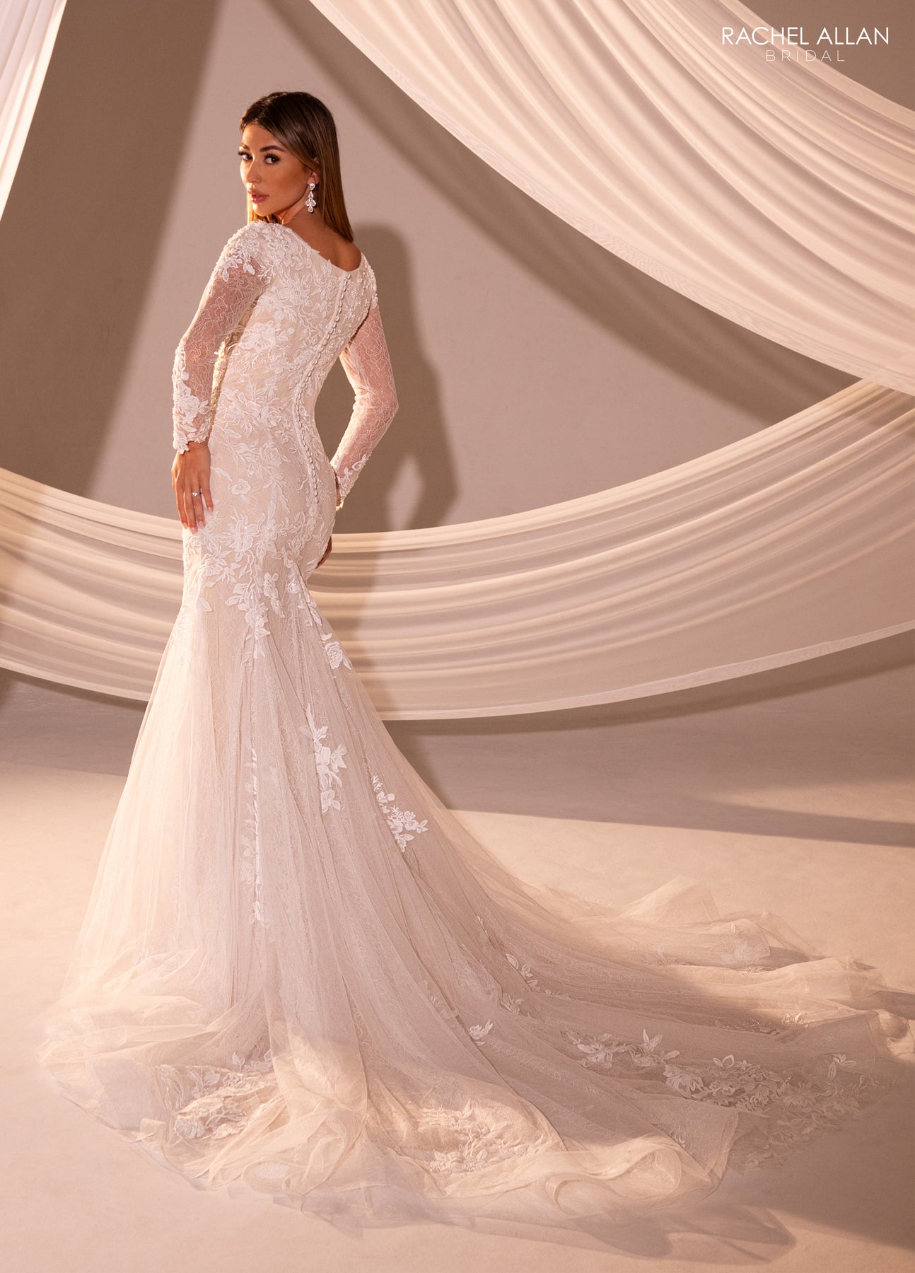 The Rachel Allan RB7017 Dress commands attention with its daring blend of classic elegance and modern allure. Featuring long lace sleeves and a bateau neckline, this mermaid silhouette sculpted gown radiates confidence. Layered tulle enriched with floral appliqué and delicate beading adds a whisper of shimmer, making every moment unforgettable. Choose Ivory Sand, Ivory, or White to define your bold, sophisticated bridal statement.