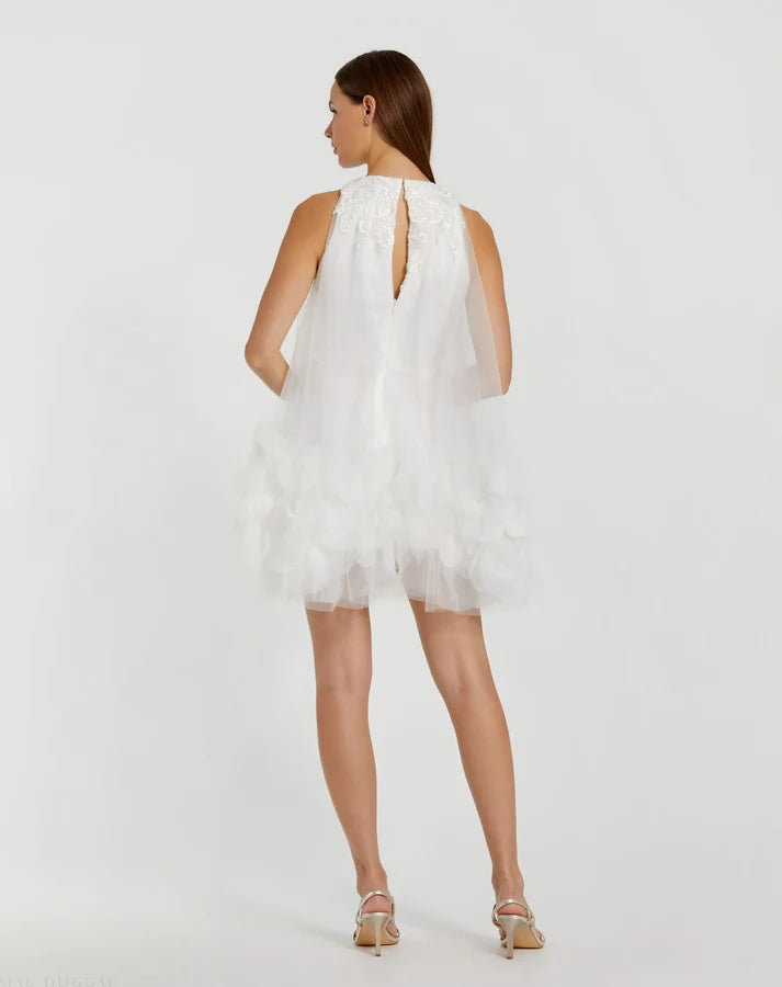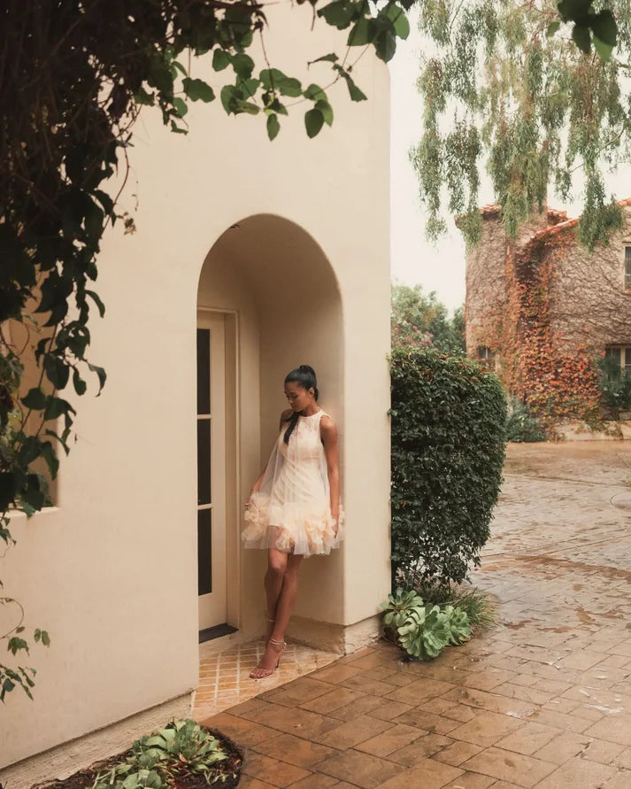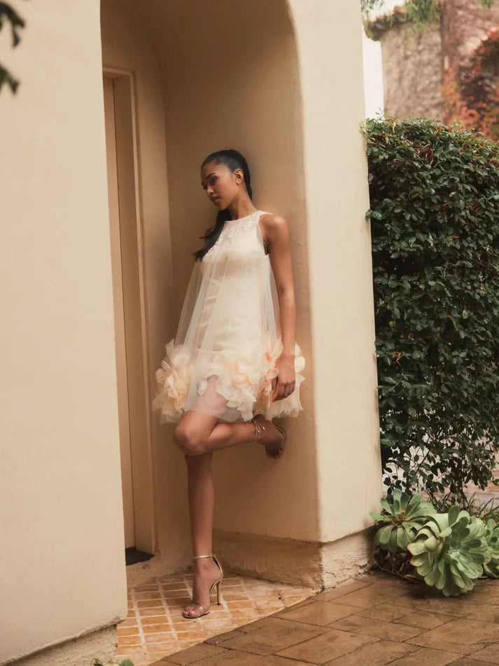 يبدأ هذا التصميم المرح بفستان قصير ضيق يتميز بأكتاف مفتوحة وتطريز على خط العنق. طبقة من التول بقصّة شبه منحرفة مزينة بنقشة زهور كبيرة الحجم تعلو الطبقة السفلية الطويلة لإطلالة عصرية وشبابية وأنيقة للغاية. أبرزي أناقة هذا الفستان بحذاء ستيليتو طويل.