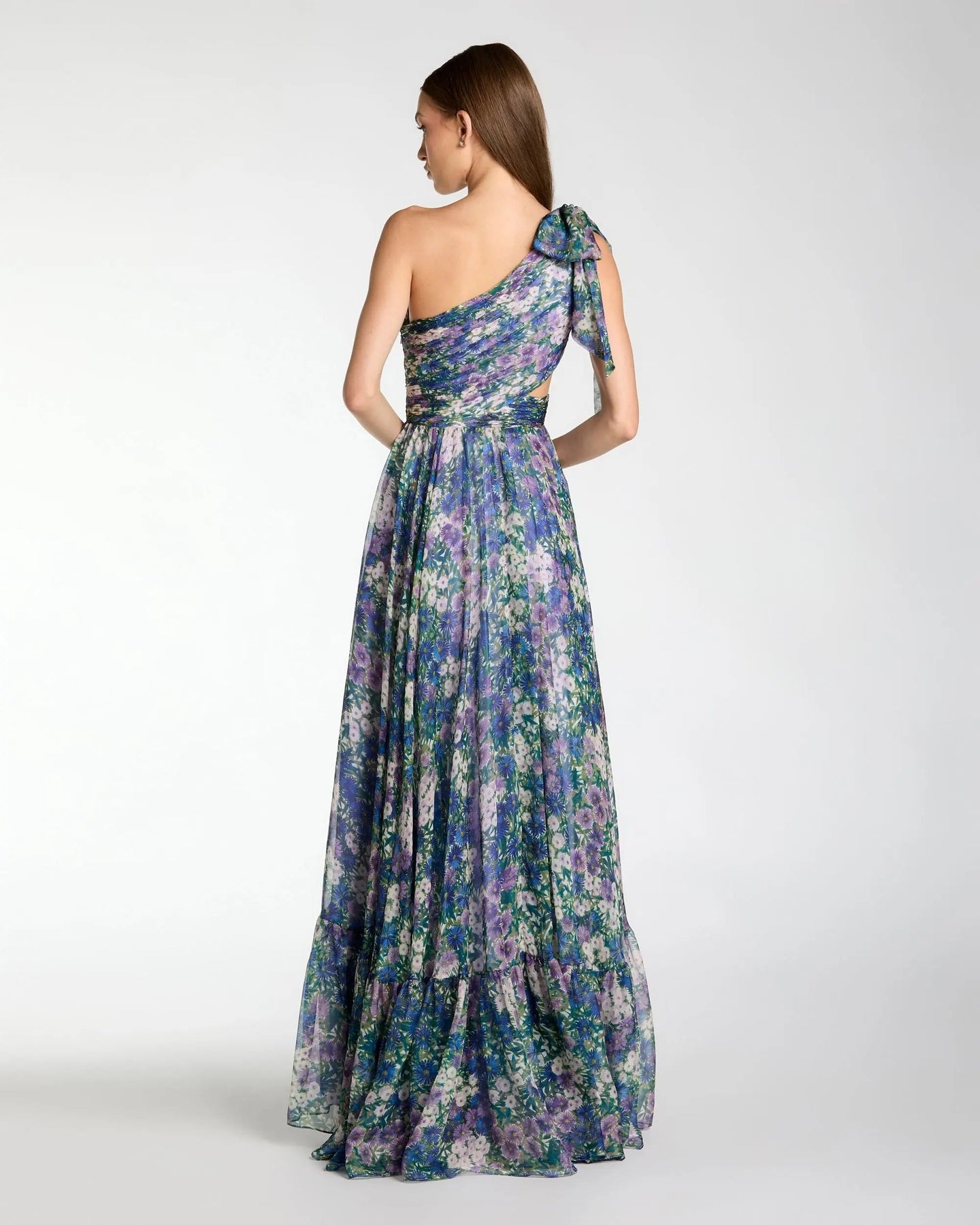 This multicolor one-shoulder gown is made from a lightweight floral-printed chiffon fabric. The thigh-high slit adds a touch of elegance while the one-shoulder neckline with tie detail offers a unique and stylish twist. Perfect for weddings, this gown blends comfort and fashion effortlessly.