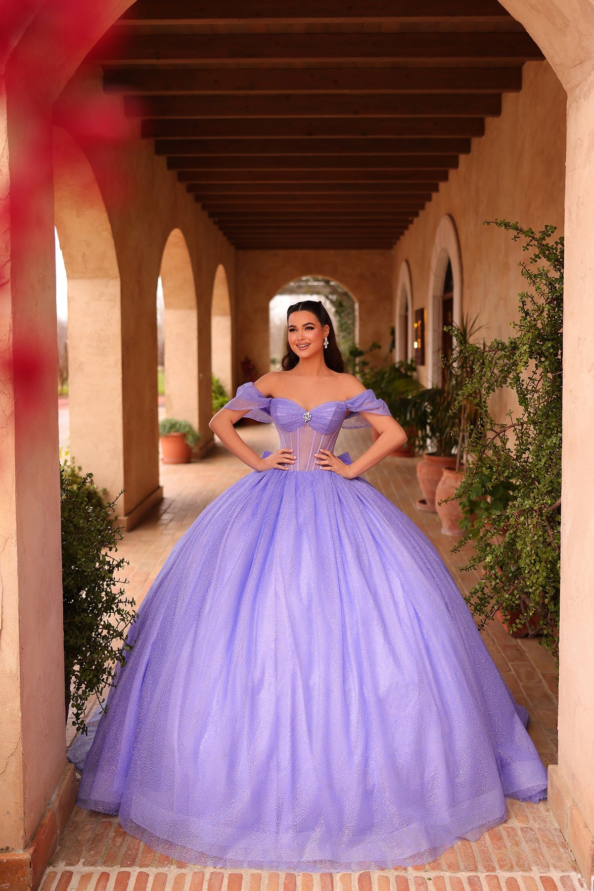 Step into the spotlight with the Amarra 54107 Dress, a sparkling dream come true. This floor-length gown features a sheer corset bodice with visible boning for a modern twist, paired with off-the-shoulder glitter tulle sleeves that add a touch of whimsy. The full shimmering skirt flows like a fairy tale, making it perfect for quinceañeras, pageants, or any celebration where you want to shine bright and feel like royalty.