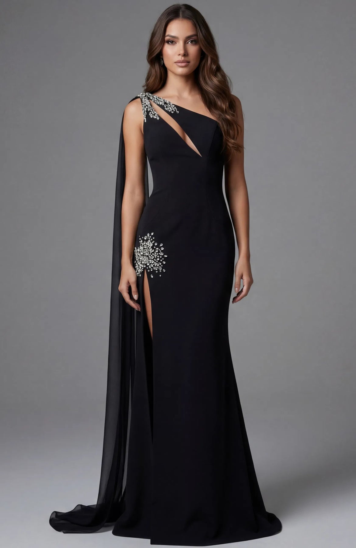 The Jovani 45125 is an elegant floor-length gown designed to make a statement. Featuring a sophisticated one-shoulder neckline with a keyhole cutout, this dress combines modern style with timeless glamour. The fitted column silhouette is beautifully enhanced by embellished appliqués at the shoulder and hip, while a flowing chiffon cape adds dramatic movement. A thigh-high slit provides both comfort and allure, and the open back with zipper closure creates a stunning finishing touch. Crafted in luxurious crepe, this gown is perfect for formal events where you want to feel confident and radiant.