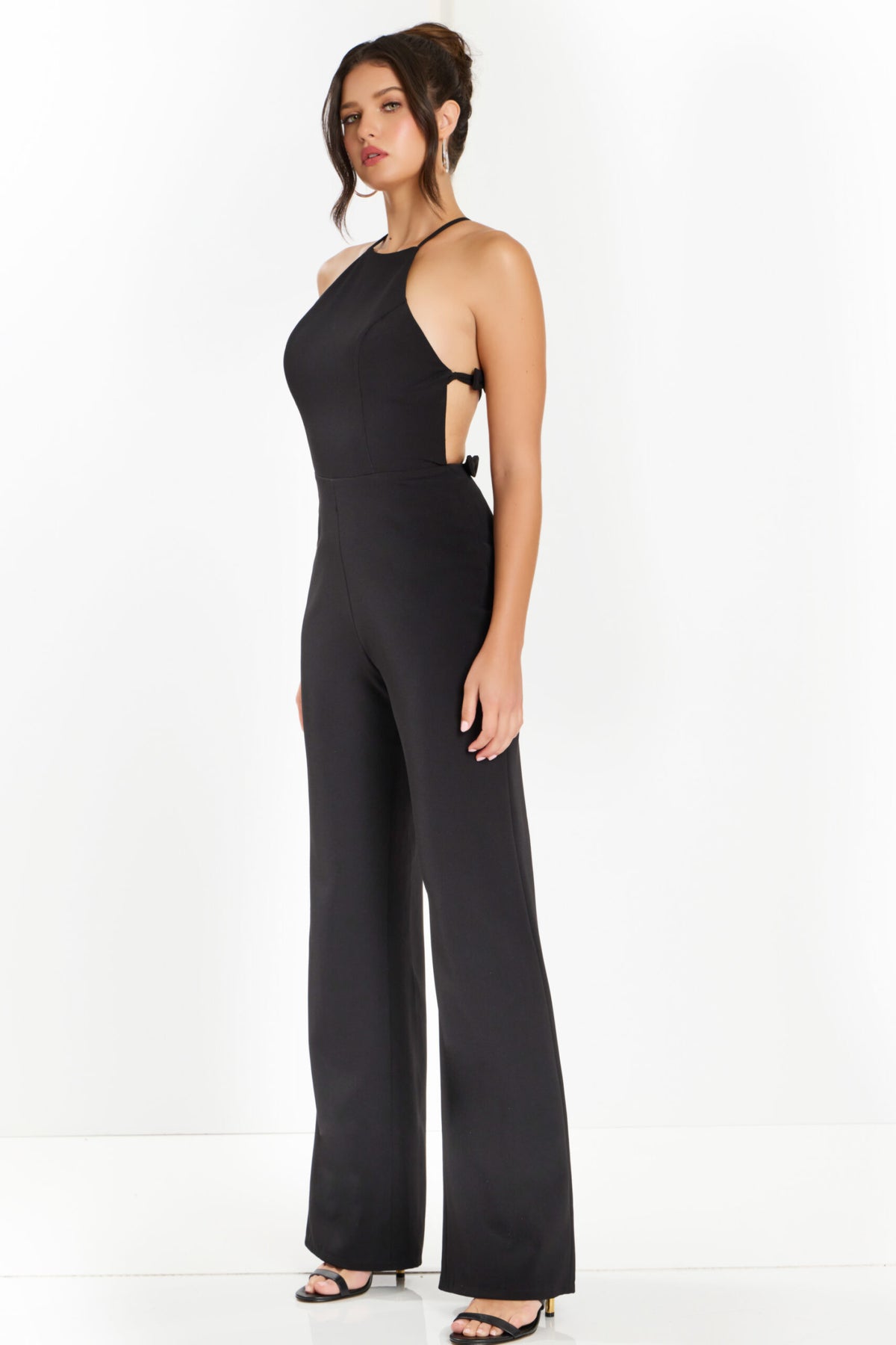 Command attention in the Jovani 46558 Jumpsuit, a sleek black essential with unexpected personality. The sophisticated halter neckline pairs beautifully with a playful strappy back adorned with charming bow accents that add just the right amount of flirtation. This piece effortlessly transitions from cocktail parties to special events, delivering polished style without taking itself too seriously. Comfortable enough to move and dance in, yet striking enough to make a lasting impression—this is the jumpsuit that proves elegance and fun go hand in hand.