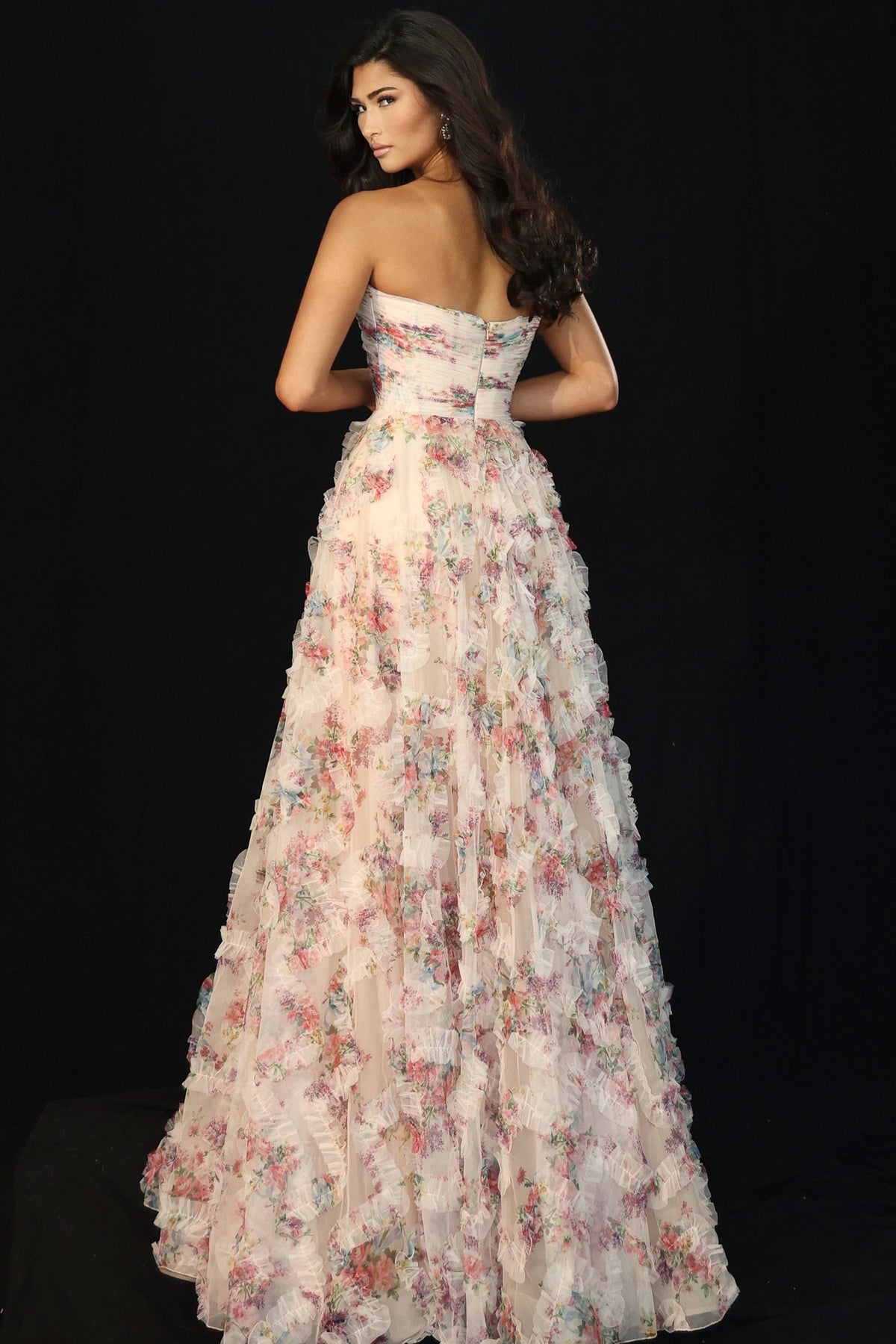 Elevate your special occasion with the stunning Jovani 46783 Dress. This breathtaking ball gown features a romantic strapless sweetheart neckline and fitted bodice that flatters your silhouette beautifully. The voluminous skirt showcases delicate layered ruffles and an enchanting floral print in printed organza, creating movement and dimension with every step. A convenient zipper back ensures easy wear, while the floor-length design delivers timeless elegance. Perfect for galas, or formal events where you want to make an unforgettable impression.