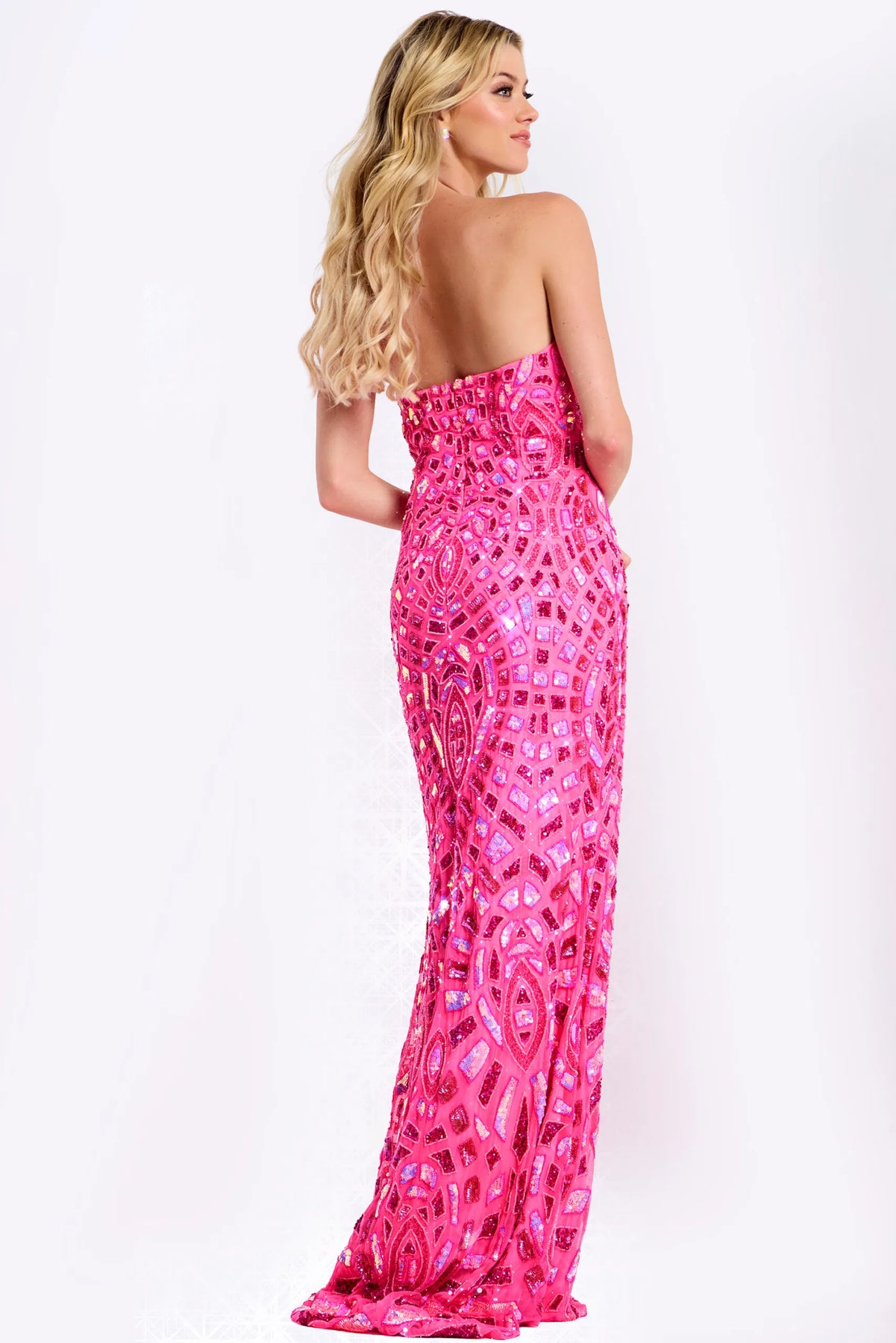 Radiate elegance in this stunning Jovani 46938 dress, designed to make you feel absolutely confident. The strapless sweetheart neckline frames your shoulders beautifully, while the fitted sheath silhouette creates a flattering, streamlined look. Crafted from luxurious stretch mesh adorned with sequins, this gown features intricate mosaic pattern beading that catches the light with every movement. The subtle shine and fitted bodice emphasize your best features, while the dramatic low back with zipper closure adds an alluring touch of sophistication. Perfect for formal occasions, this floor-length masterpiece combines comfort with glamour, allowing you to move with grace and poise throughout your special event.
