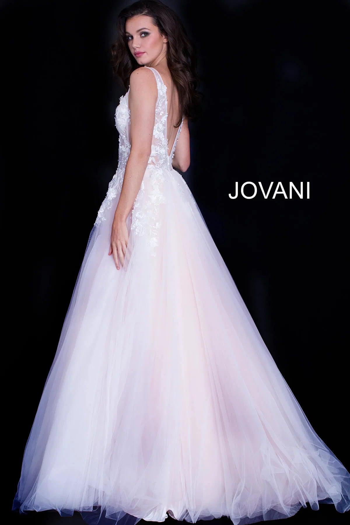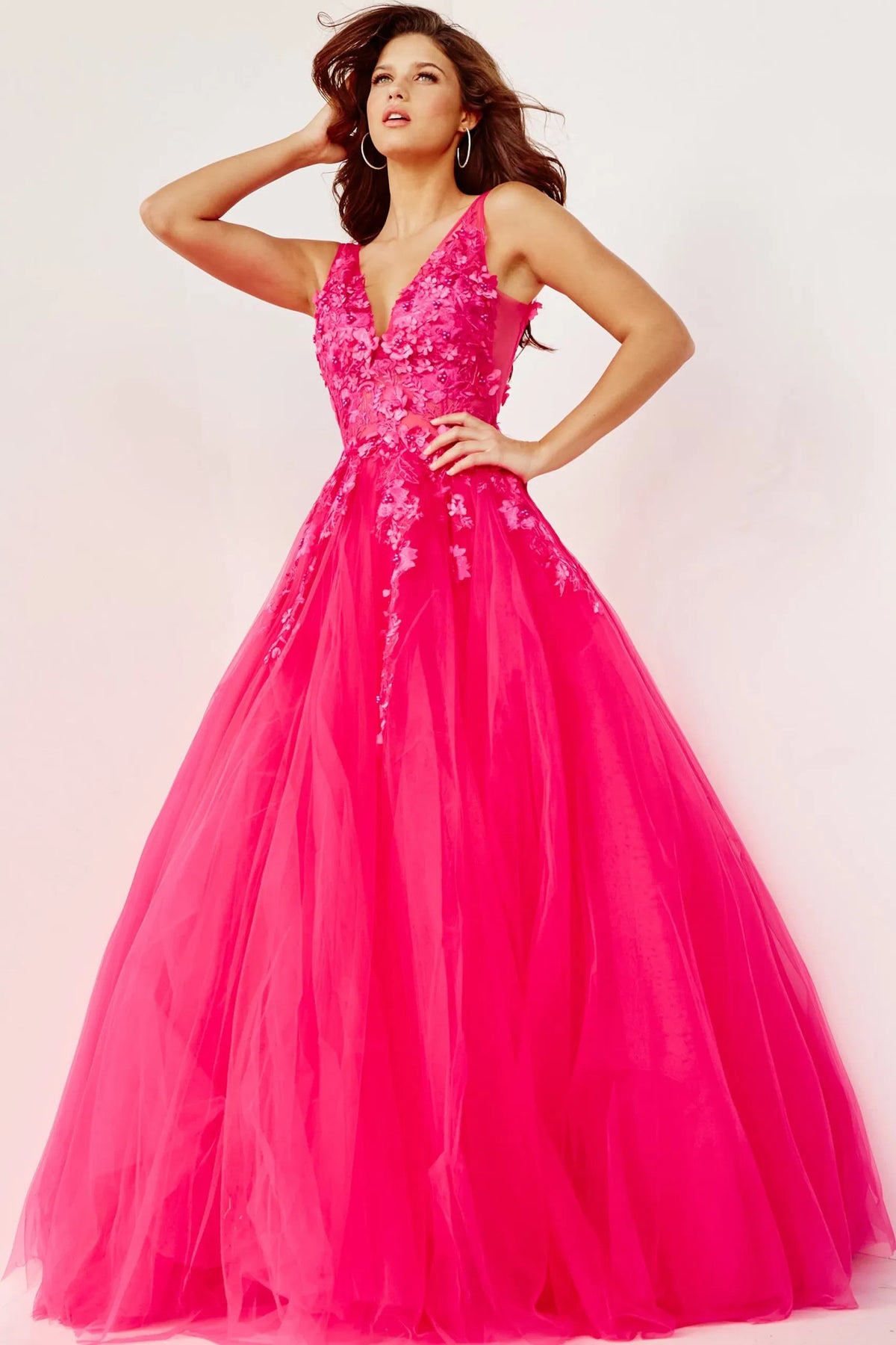 Elevate your evening with the stunning Jovani 55634 Dress, a show-stopping floor-length gown designed to make you feel absolutely radiant. This sleeveless A-line ballgown features an elegant V-neckline and an alluring open back that adds modern sophistication. Crafted from luxurious sheer tulle, the dress is adorned with intricate floral appliques, delicate rosettes, and shimmering sequins that catch the light beautifully. The zipper closure ensures a perfect fit, while the voluminous silhouette flatters every figure. Perfect for galas, and unforgettable celebrations, this dress combines timeless elegance with contemporary glamour.