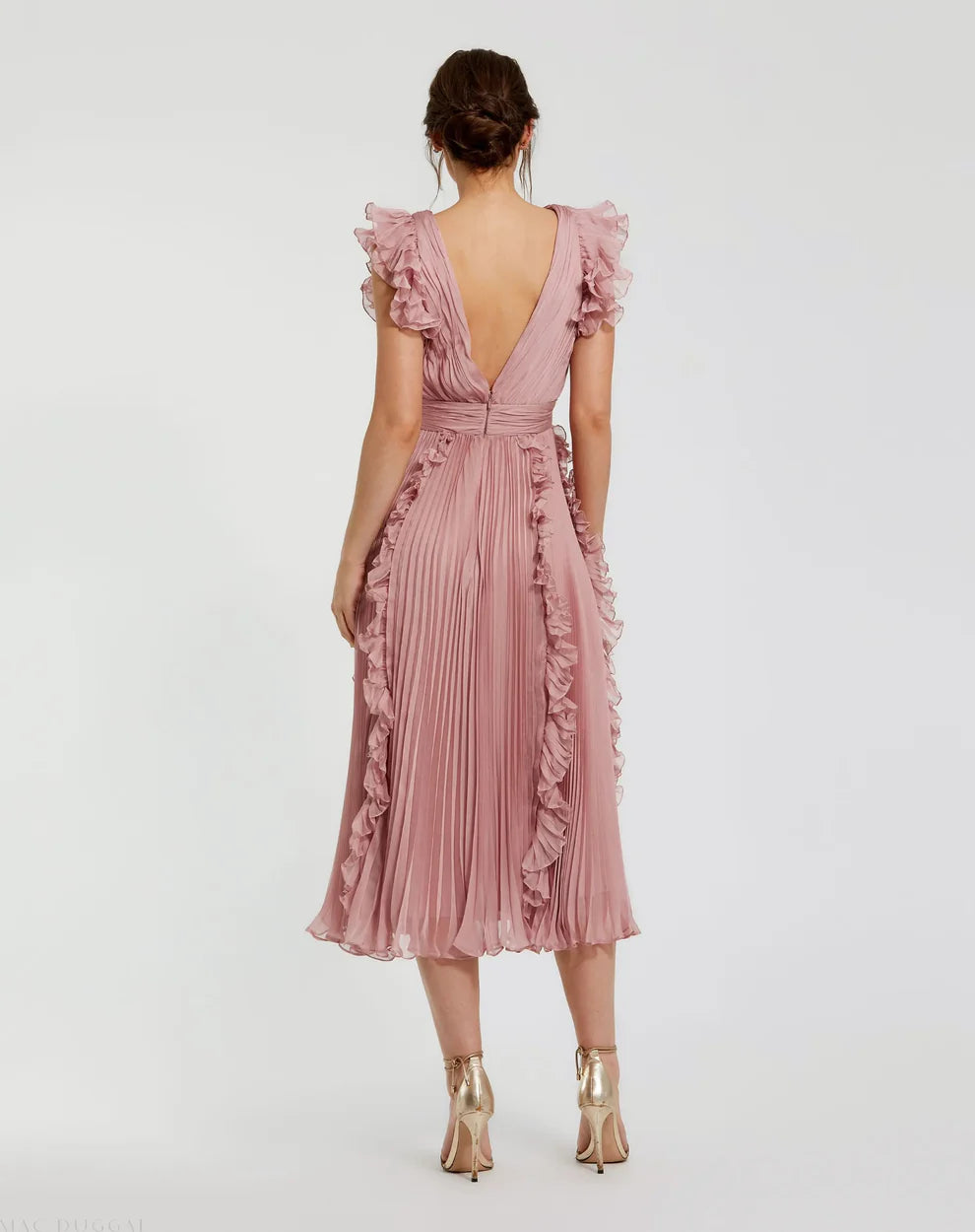 هذا الفستان الميدي المكشكش، الأنيق والعصري، هو الإطلالة المثالية لأي مناسبة. مصنوع من الشيفون المنسدل، يتميز بفتحة رقبة على شكل حرف V، وأكمام قصيرة مكشكشة، وتفاصيل مطوية.