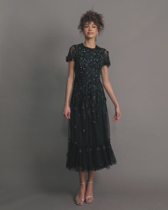 تألقي بفستان ماك دوغال 9212، بياقته العالية المزخرفة وأكمامه القصيرة. يضفي عليه التطريز الزهري مع تفاصيل الخرز لمسة من الأناقة، بينما تضفي حافة الكشكشة لمسة مرحة. (من منا بحاجة إلى تاج مع هذا الفستان؟!)
