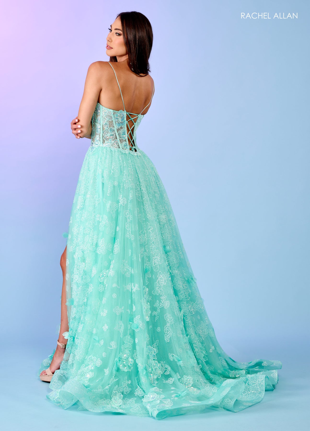 Step into the spotlight with the Rachel Allan 70557 Dress! This dreamy tulle gown dazzles with glittery texture and delicate 3D flower appliques. Its off-the-shoulder neckline and flowing A-line silhouette promise a graceful, fairy-tale vibe. Intricate beading adds just the right sparkle to keep all eyes on you—get ready to shine and twirl the night away in effortless style!