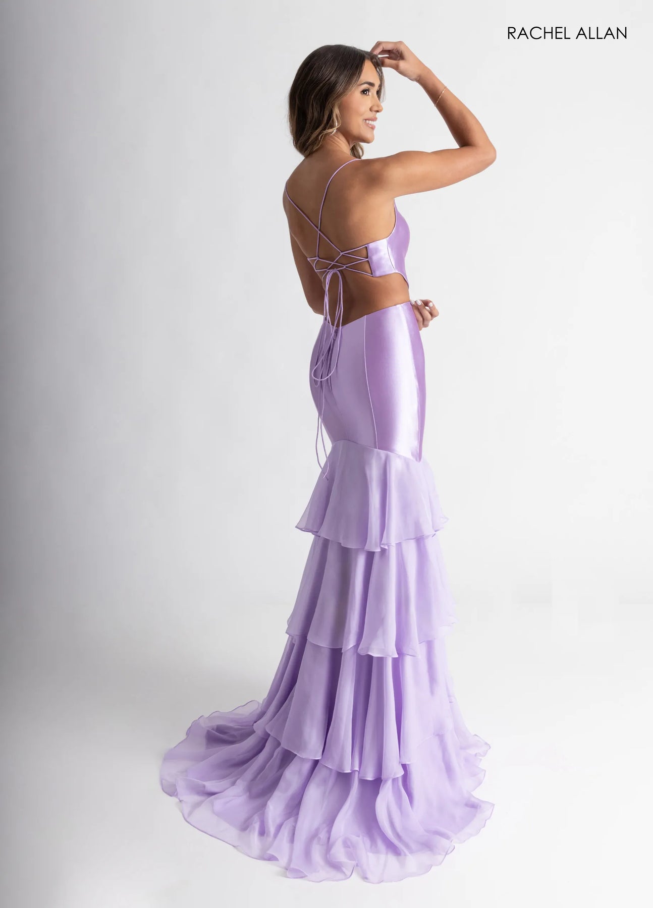 Embrace elegance in this stunning Rachel Allan gown that combines sophistication with modern flair. The stretch satin jersey fabric drapes beautifully while the fitted bodice showcases daring side cutouts and intricate 3D floral embellishments. A lace-up back ensures a customized fit that flatters your silhouette. Cascading tiered chiffon ruffles add dynamic movement and texture to the skirt, creating a show-stopping effect with every step. Perfect for making an unforgettable entrance at your next special occasion.