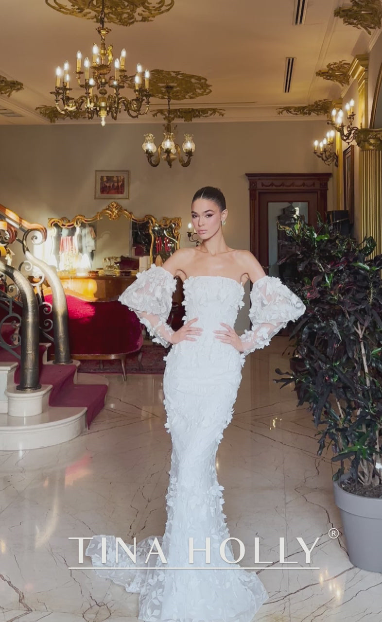 Introducing the Tina Holly TW121W, a breathtaking bridal masterpiece designed for the modern bride who refuses to compromise on elegance. This stunning mermaid gown features an exquisite straight-across neckline that gracefully frames the shoulders, creating a timeless silhouette that commands attention as you walk down the aisle. Crafted from luxurious soft tulle and adorned with intricate 3D lace detailing, this dress combines romance with contemporary sophistication. The mermaid cut hugs your curves beautifully before flowing into an ethereal train, ensuring you feel confident and radiant on your special day. Every stitch celebrates your unique beauty, making this gown the perfect choice for a bride seeking something truly extraordinary.