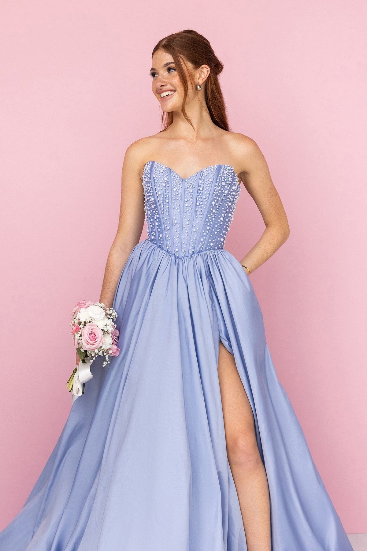 Introducing the Portia & Scarlett XO178—a stunning gown that masterfully balances structure and movement. The strapless bodice features intricate bead detailing that catches the light beautifully, flowing into a graceful A-line skirt with a daring high leg slit. A pleated waist defines your silhouette while the corset-style back provides exceptional support and comfort. Finished with an elegant sweeping train, this dress embodies timeless sophistication with a contemporary edge, making it the perfect choice for your most memorable moments.
