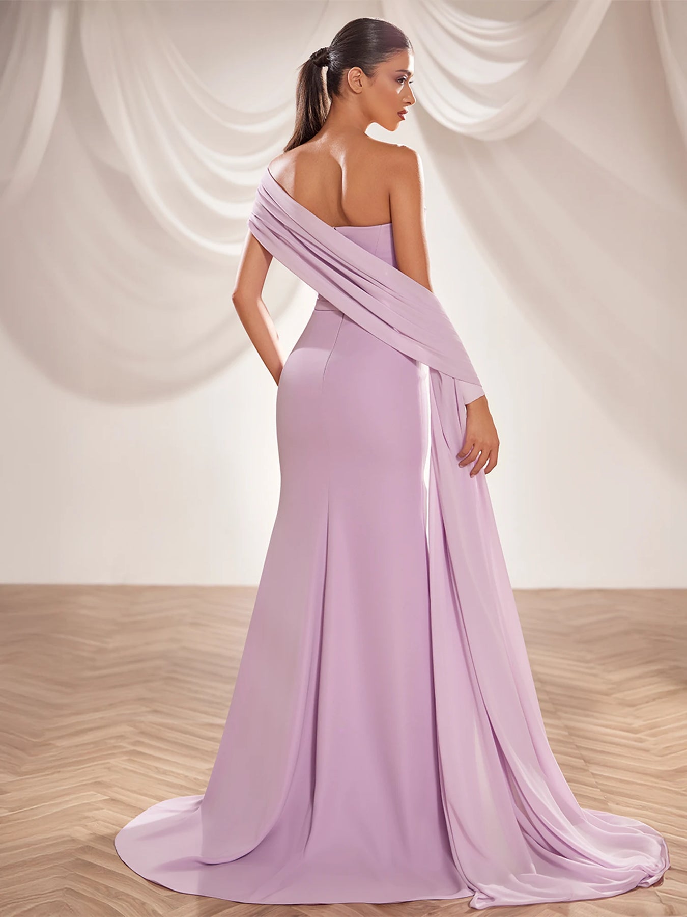 Slip into pure elegance with the Reverie Couture SS253—a strapless lilac dream that hugs your curves in all the right ways. Luxurious draped fabric cascades gracefully, creating an enchanting silhouette that's equal parts sophisticated and show-stopping. Perfect for those moments when you want to feel absolutely radiant and utterly unforgettable. This gown transforms any occasion into your personal red carpet moment.