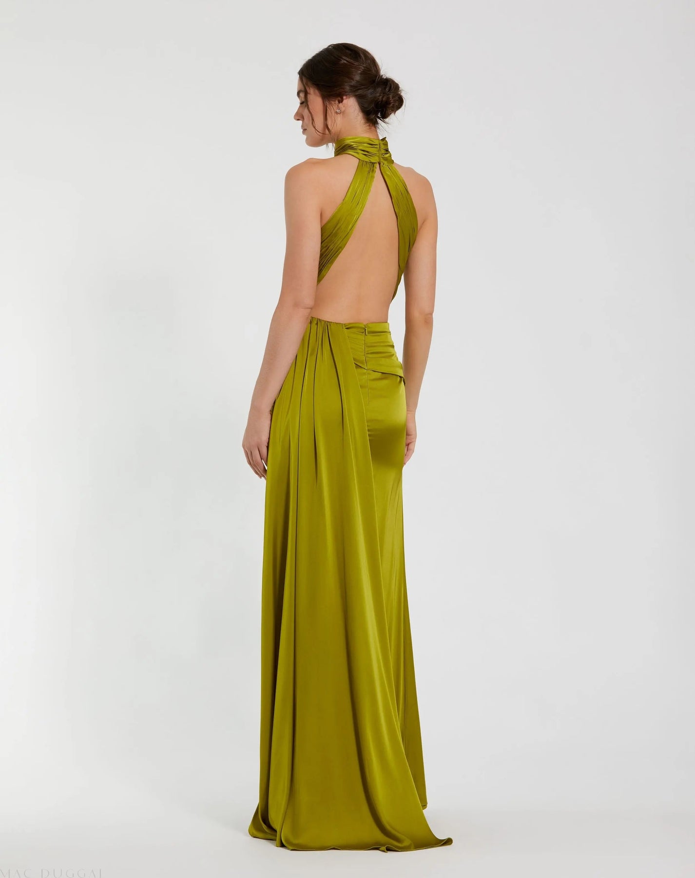 Experience sophistication in this stunning Open Back High Neck Side Ruched Gown. Crafted from luxurious satin fabric, it features a halter neckline, ruched waist detailing, and a thigh-high slit, making it the perfect gown for any special occasion.