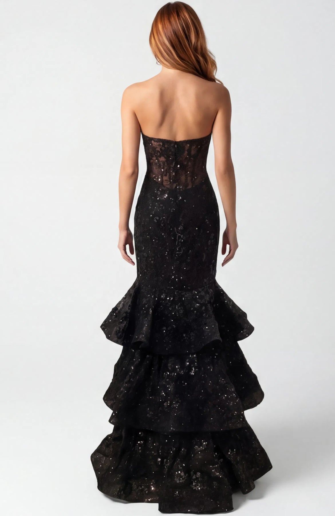 This stunning Jovani 46821 dress commands attention with its glamorous mermaid silhouette and all-over sequin embellishment. The strapless neckline and sleeveless design showcase your shoulders, while the structured corset bodice provides elegant support and definition. Tiered ruffles cascade down the skirt, adding movement and dimension to this show-stopping floor-length gown. The straight back features a lace-up corset detail that combines classic elegance with modern flair. Perfect for formal events, galas, or red carpet moments, this dress ensures you'll feel confident and radiant.