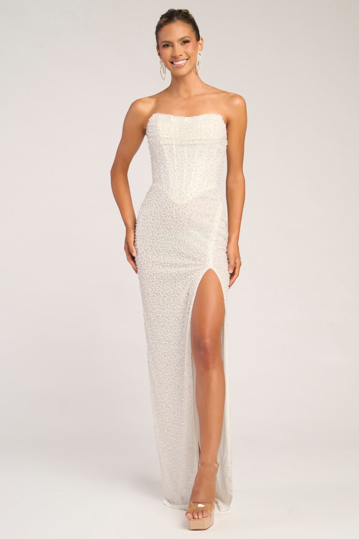 Turn heads with this PS26309E elegant long dress featuring a daring high slit and sparkling beadwork for effortless glamour. The sleeveless design and open back add a flirty touch, while the straight-across neckline keeps it chic. Perfect for making a playful yet sophisticated statement at any special occasion.