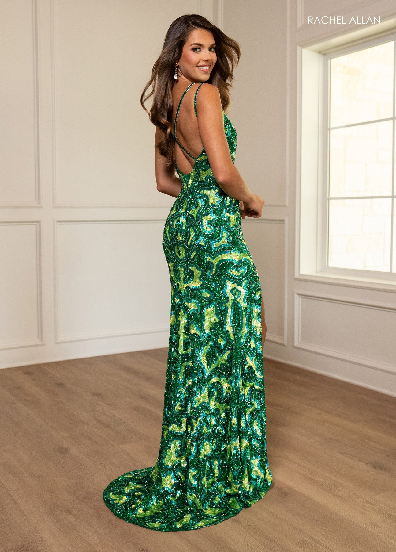 Make a bold entrance in the Rachel Allan 70725 Dress, a dazzling sleeveless gown designed to capture every eye. Crafted from stretch tulle and adorned with intricate beadwork, this fitted dress features a plunging V-neck and a daring thigh-high slit that enhances your silhouette with striking elegance. Delicate straps and a low back add a sensual touch, making it the ultimate choice for prom, red carpet events, or any occasion where you want to shine fearlessly. Available in Red Multi, Emerald Multi, and Lilac Multi, sizes 00 to 12.