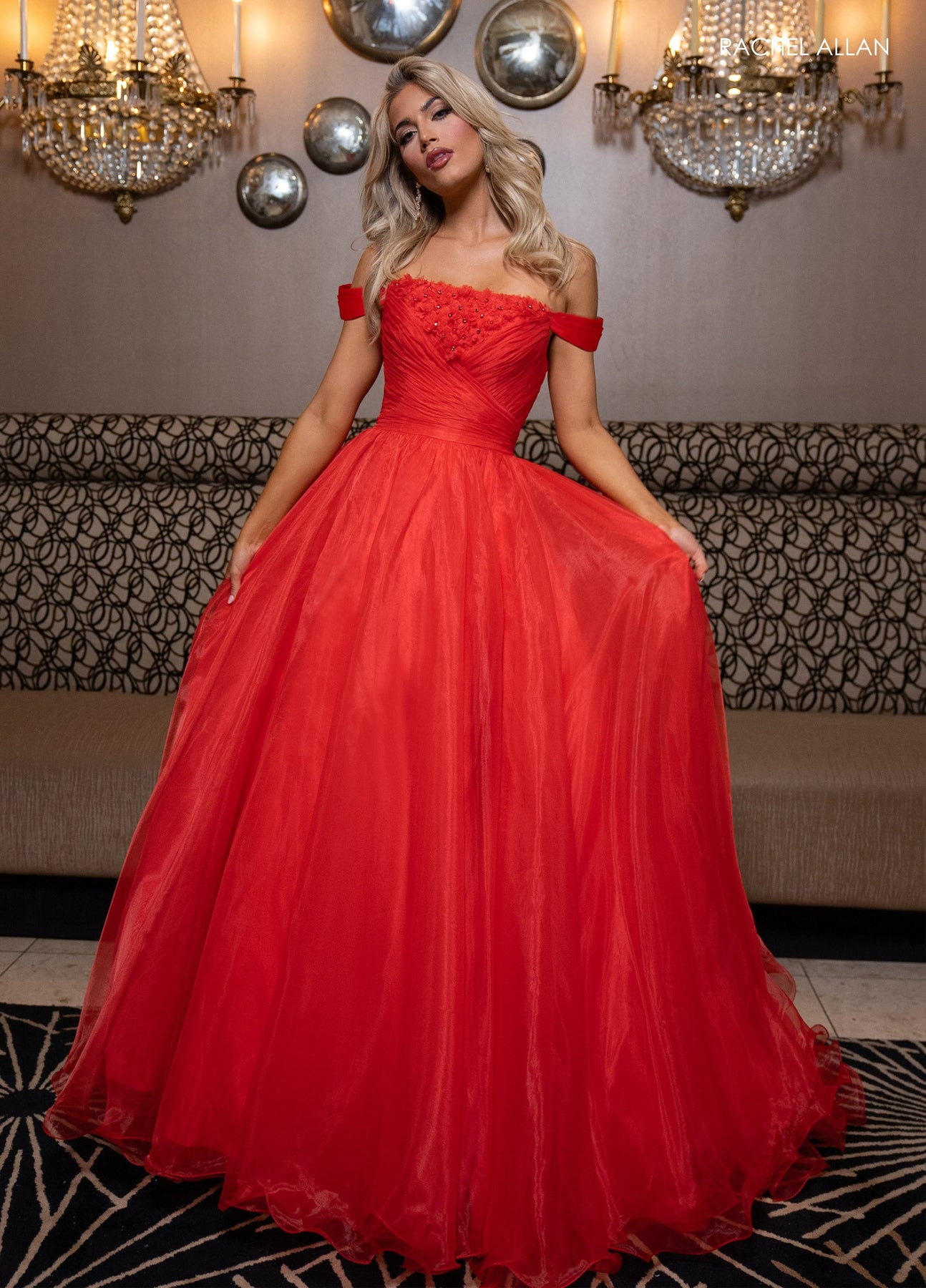 Step into the spotlight with the Rachel Allan 70865 Dress, a daring organza masterpiece that commands attention. Its off-the-shoulder neckline boasts intricate 3D floral beading, blending romantic elegance with bold detail. The A-line silhouette flows into a full skirt featuring a thigh-high slit, revealing just enough to ignite intrigue. Fully lined with bra cups for support, this gown combines comfort with breathtaking style. Available in striking pink, aqua, and red, this dress is your ultimate choice for making a statement at prom or any grand event. Own the night like royalty.