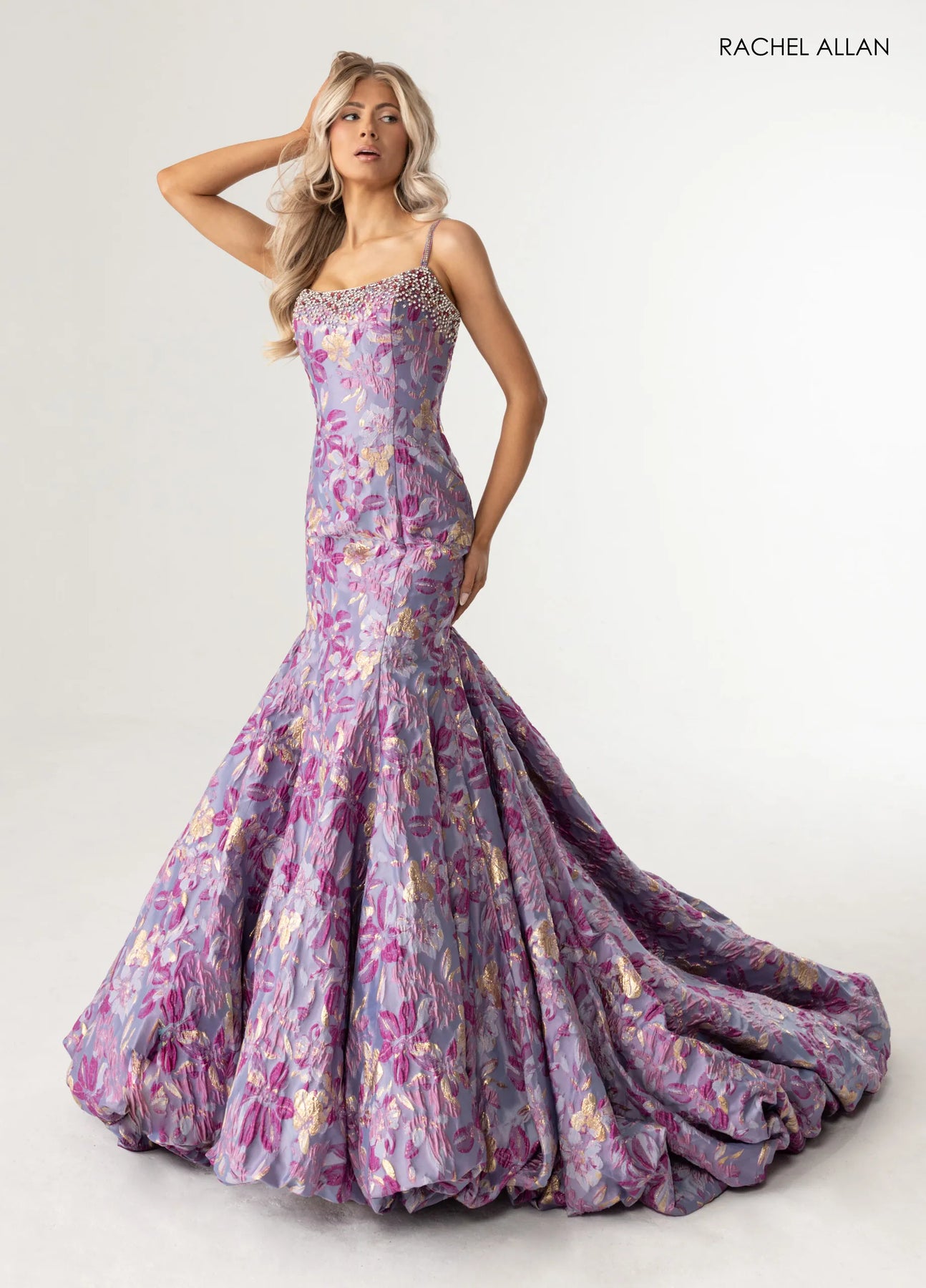 Make a statement in the Rachel Allan 70988, a stunning jacquard mermaid gown that commands attention. Intricate floral texturing and shimmering crystal beading create visual depth across the bodice, while the fitted silhouette gracefully transitions into a dramatic flared hem. Delicate spaghetti straps frame the strapless neckline, adding romantic sophistication to this show-stopping design. Whether you're stepping into a special occasion or celebrating a milestone moment, this gown delivers the elegance and confidence you deserve.