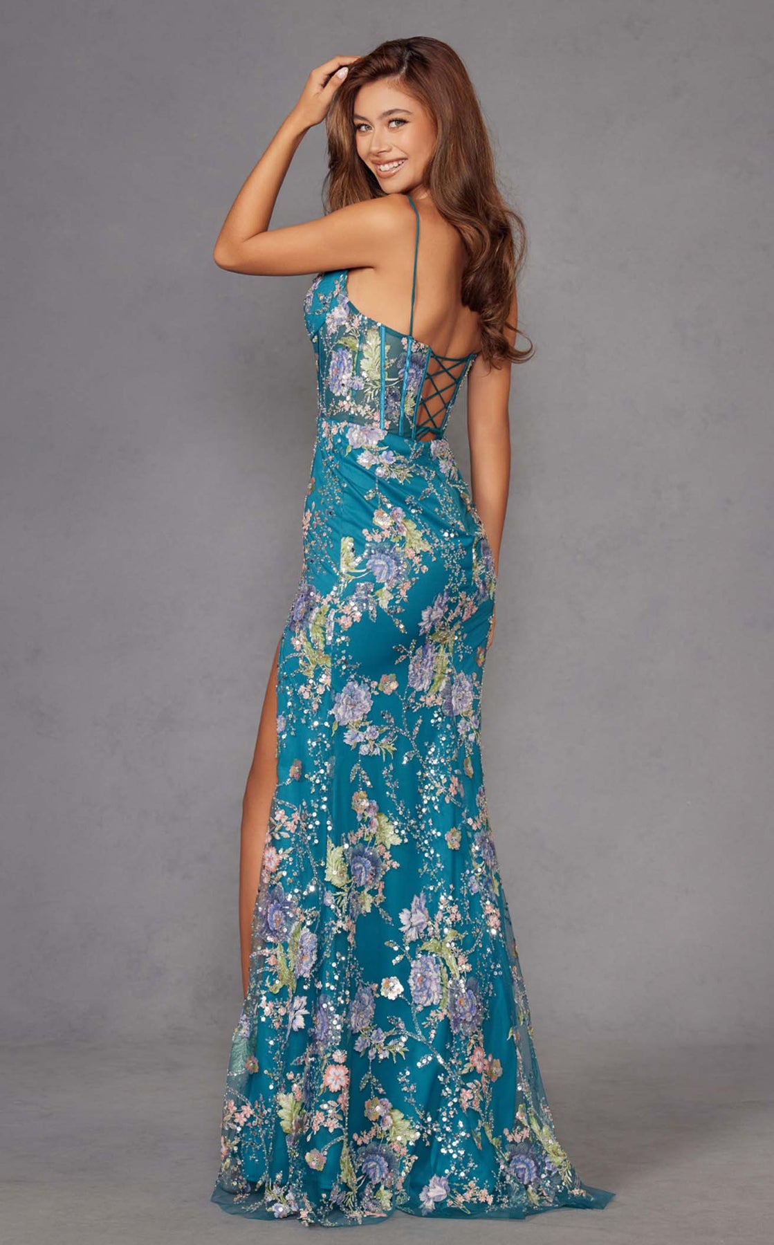 The Juliet JT2505A is a stunning long dress designed to make you feel confident and radiant. Featuring a romantic sweetheart neckline and structured bodice with visible boning, this piece offers flattering support with a corset-inspired silhouette. The delicate sheer floral overlay brings an ethereal elegance, while the high leg slit adds a touch of modern sophistication. Whether you're attending a wedding, gala, or special celebration, this dress empowers you to express your unique style and leave a lasting impression.