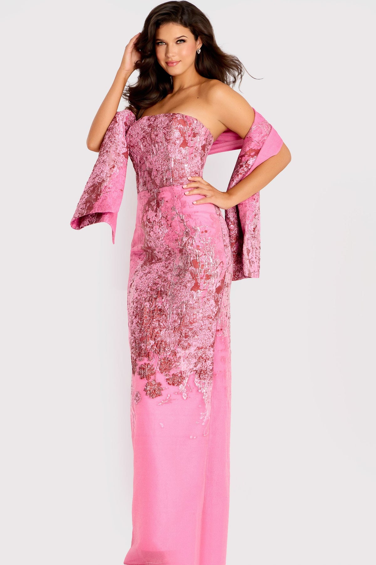 This stunning Jovani 46258 dress features a sophisticated strapless straight neckline with a sleek column silhouette that flatters every figure. Crafted from luxurious embroidered tulle adorned with a beaded overlay, the gown showcases intricate floral embroidery and sparkling sequin accents throughout. The floor-length design includes a graceful back slit for ease of movement, while the fitted back with zipper closure ensures a secure, elegant fit. A matching shawl completes this show-stopping ensemble, perfect for formal events and special occasions where you want to feel absolutely radiant.