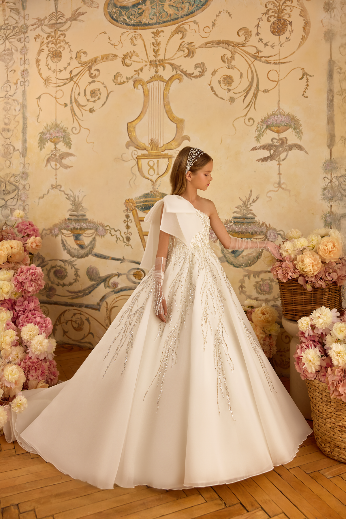 The PENTELEI 3808 Dress is a daring long-length gown featuring a bold one-shoulder neckline topped with a huge bow on the strap for a striking visual impact. Delicate beading appliqués add a touch of sparkle, while the sheer beaded gloves complete this fearless and elegant look—perfect for making a memorable statement at any special event.