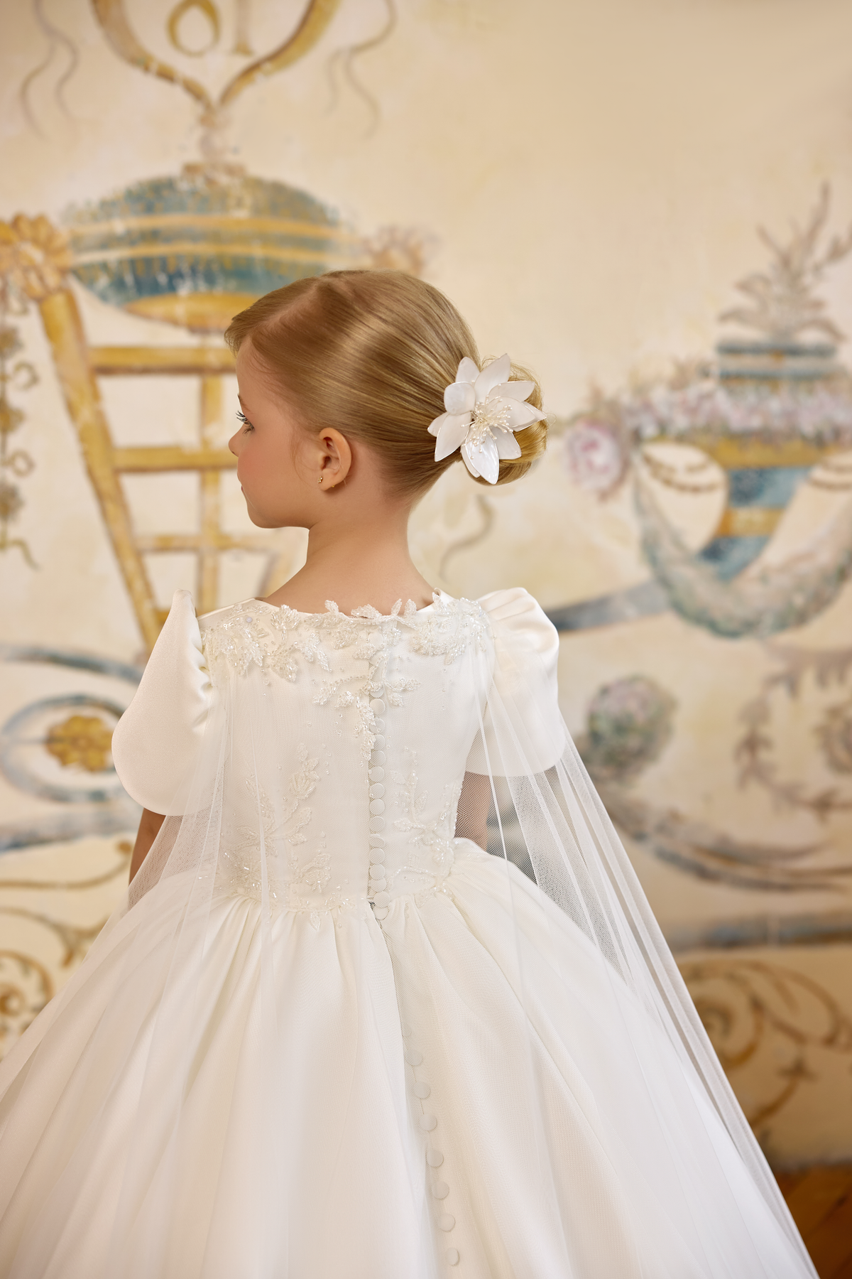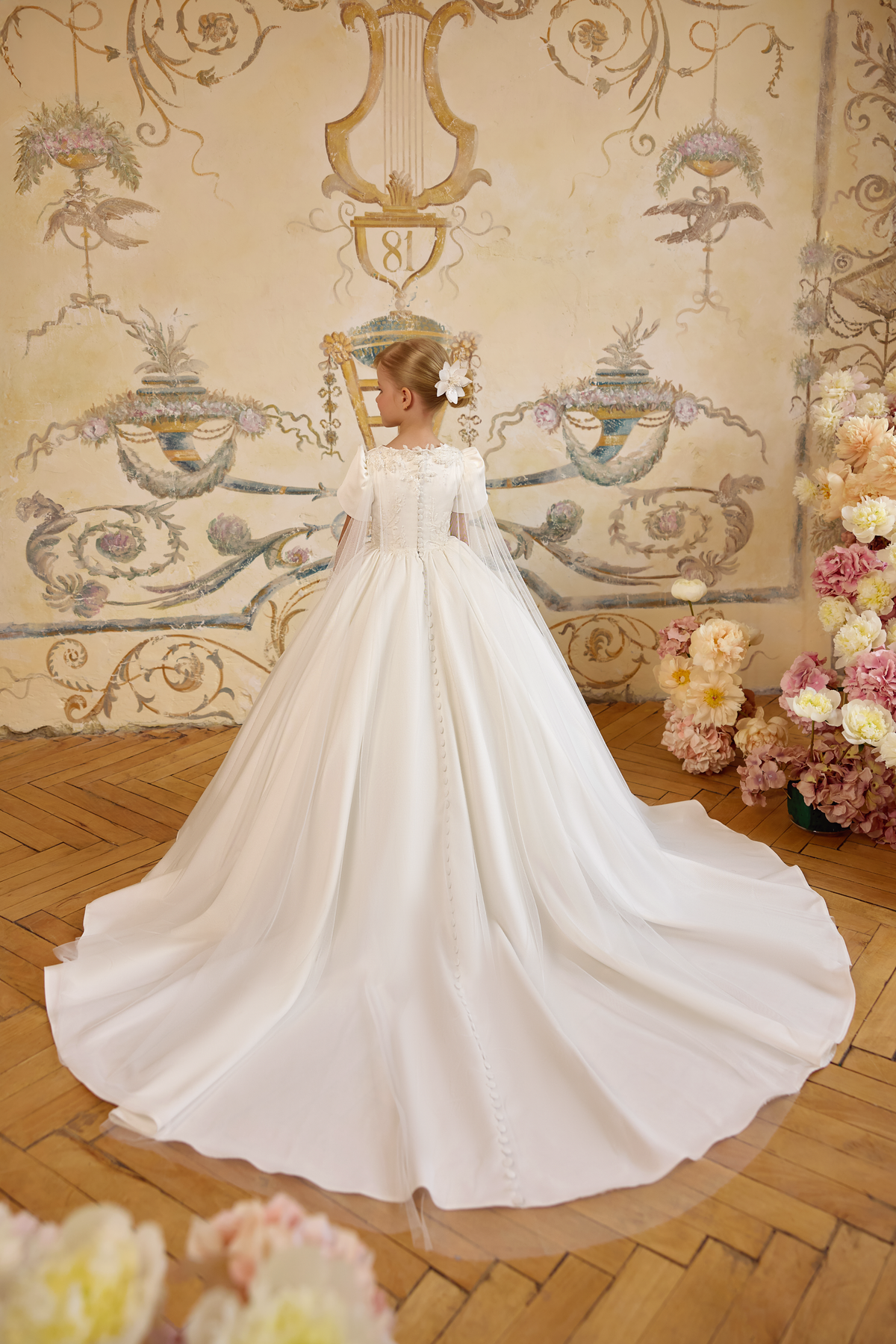 The PENTELEI 3828 Dress is a playful long-length gown featuring a charming boat neckline decorated with delicate floral appliqués. Its covered back gracefully extends into an elegant train, creating a delightful and sophisticated look that’s perfect for any special occasion.