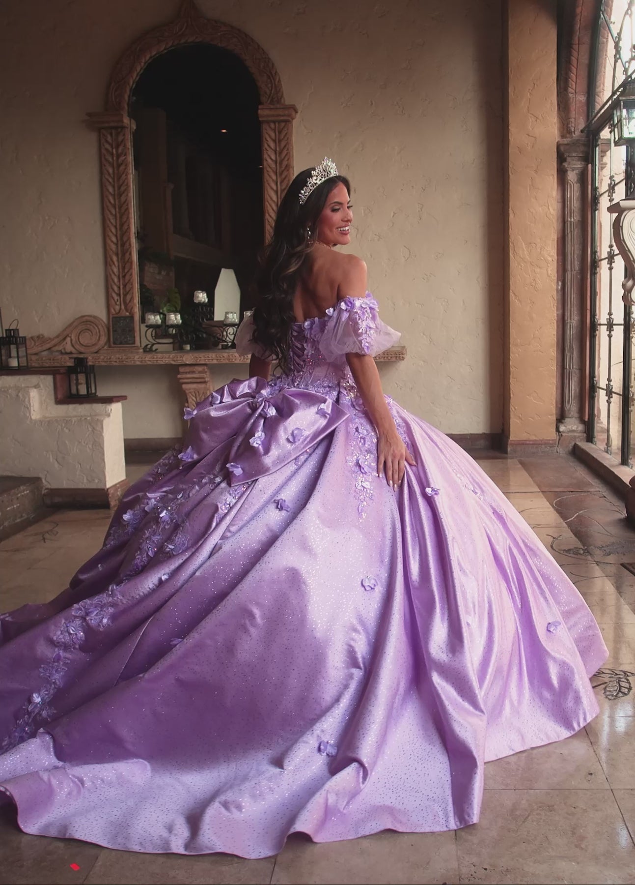 Celebrate your special day in the Rachel Allan RQ1157 Dress, shimmering in powder blue or orchid sparkle satin. This playful gown dazzles with intricate appliqués, beading, and 3D floral details on the bodice. Detachable off-the-shoulder sleeves and a big bow at the back add fun flair and elegance, making every step feel like a fairytale. Designed for your most magical moments, this dress promises to make you feel like royalty all night long.