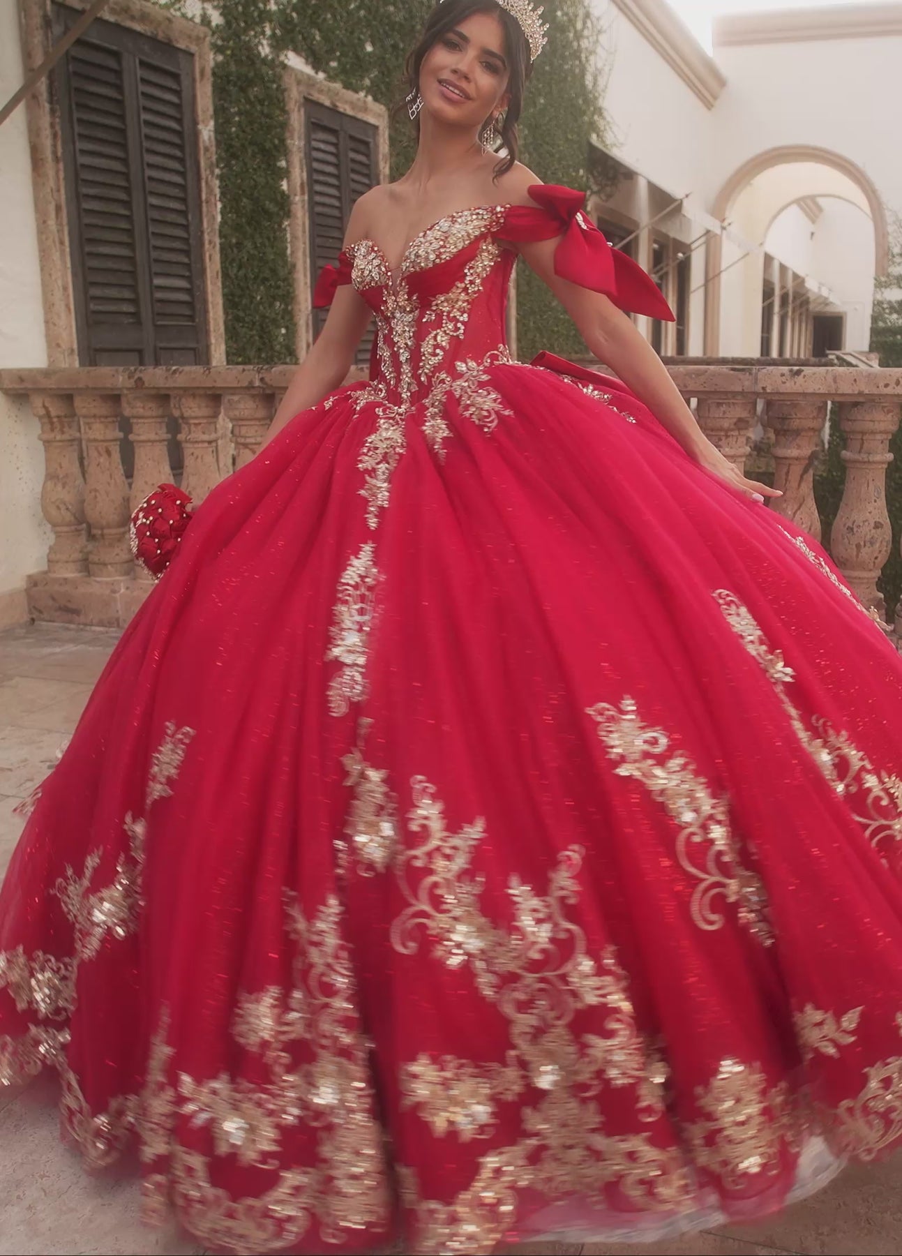 Step out and steal every gaze with the Rachel Allan RQ3155 Dress. Available in dazzling Red Gold, Blush Rose Gold, or Cloud Blue Silver, this ballgown sparkles with glitter tulle and smooth crystal satin. Adorned with 3D floral appliqués, shimmering beading, and a detachable bow, it’s pure magic. The corset-style bodice and full skirt add a royal flair perfect for quinceañeras, galas, or pageants where you’re meant to shine.